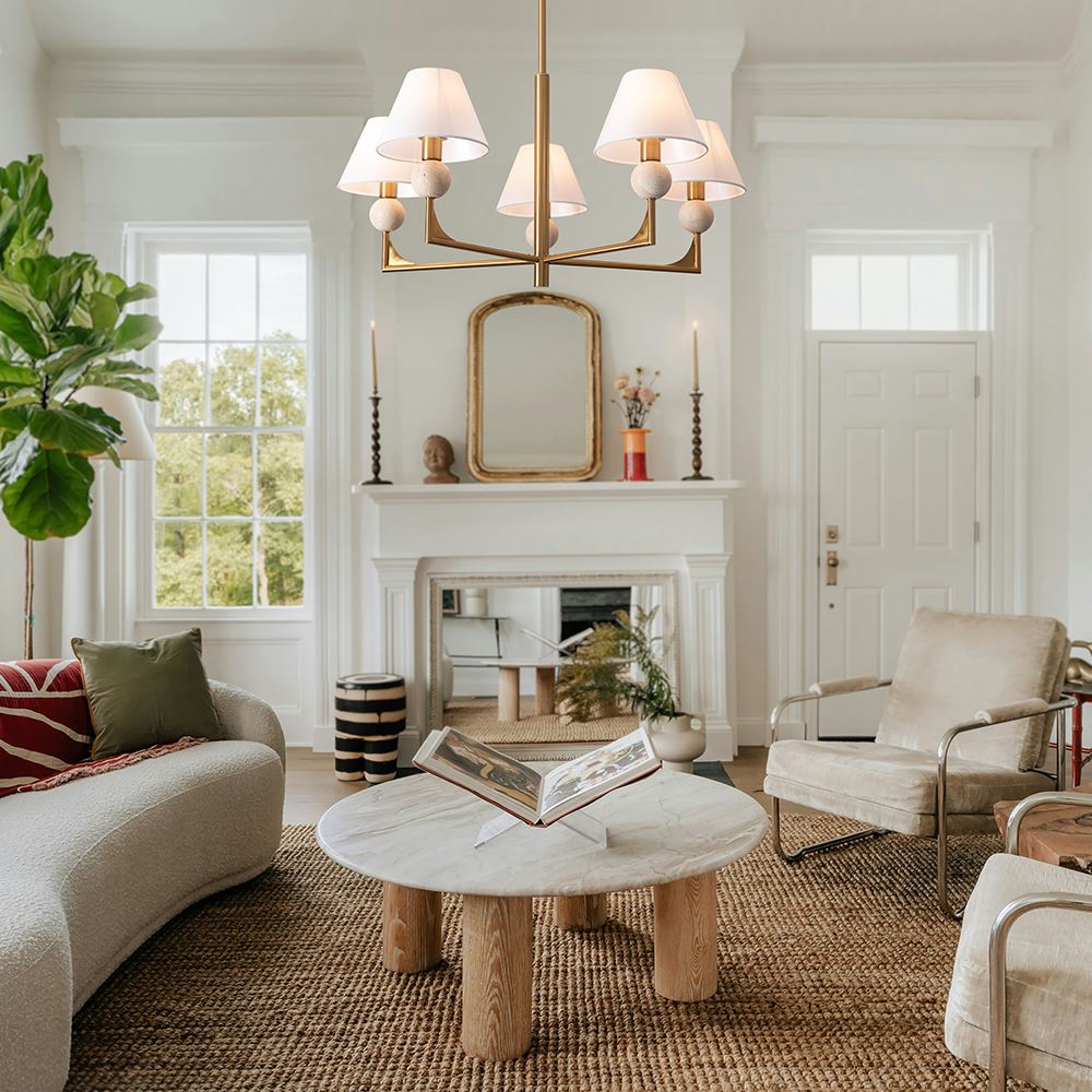 Материал арматуры — металл. Цвет металла — латунь. Абажуры выполнены из белой ткани, которые мягко рассеивают свет. Потолочные и настенные светильники с цоколем E14. Декоративные элементы в форме шара на плафоне выполнены из травертина. Металлическая форма арматуры строгой геометрической формы с пластинами из латуни. Подходит для оформления элегантных классических пространств.