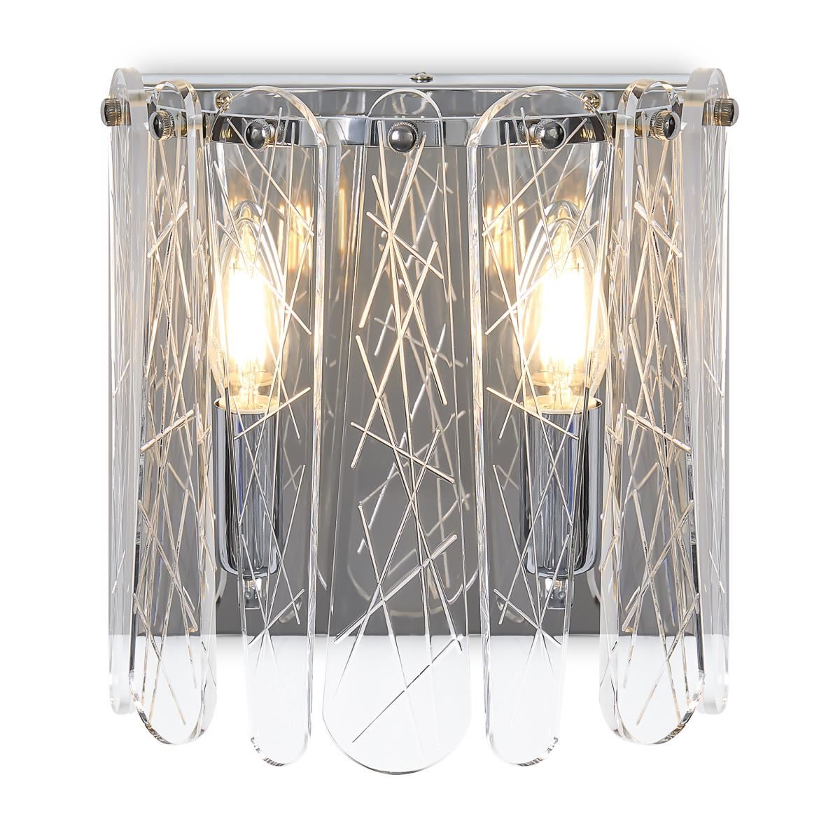 Материал арматуры — металл, цвет — хром. Светильники выполнены из хрусталя с рисунком "frozen". Подвесные светильники и бра с цоколем E14. Современный дизайн арматуры, дугообразные формы с хромированной отделкой подчеркивают декоративные хрустальные элементы. Подходит для современных интерьеров.