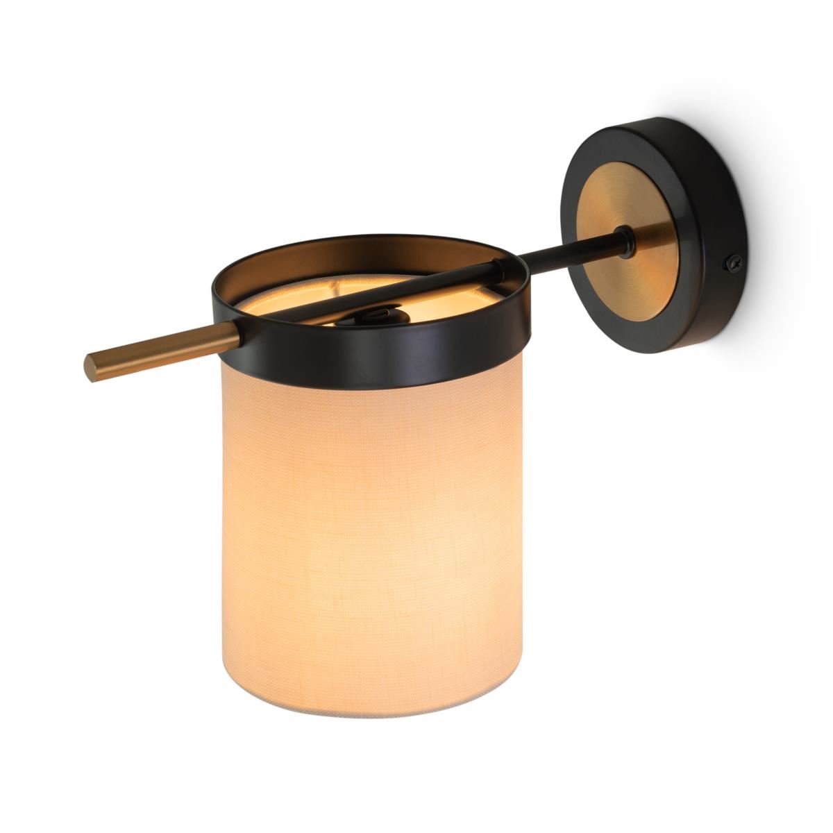 Арматура из металла. Основной цвет — чёрный, декоративные элементы в цвете латунь. Тканевые бежевые абажуры-цилиндры украшены чёрными металлическими основаниями. Компактные размеры для невысоких потолков. Источник света — лампа с цоколем Е14.