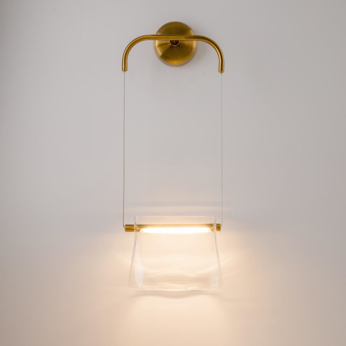 Цвет металлической арматуры — латунь с сатинированным финишем, плафоны — прозрачное стекло. Источник света: LED. Цветовая температура светильников 3000К, угол рассеивания — 120 градусов. Настенные бра и подвесные светильники оснащены регулируемым проводом длиной до 3 метров, что позволяет использовать их в помещениях с высокими потолками.
