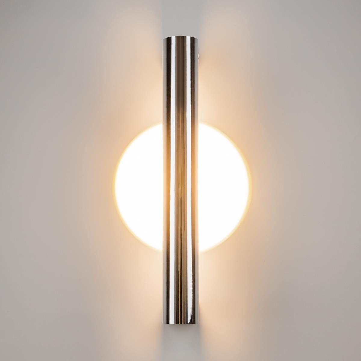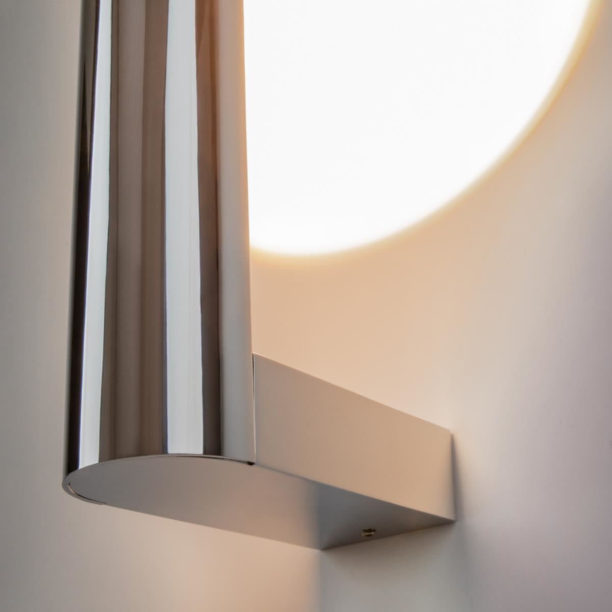 Металлическая арматура, цвета: черный, хром, золото. Источник света: LED-светодиод. Световая температура 3000К. Свет переотраженный, угол рассеивания 100 градусов. Дизайнерское решение с использованием линзы, создающей акцентный круг на стене и эффекта переотражения. Поверхность арматуры глянцевая, полузеркальная. Бра подойдет для зонирования помещений.