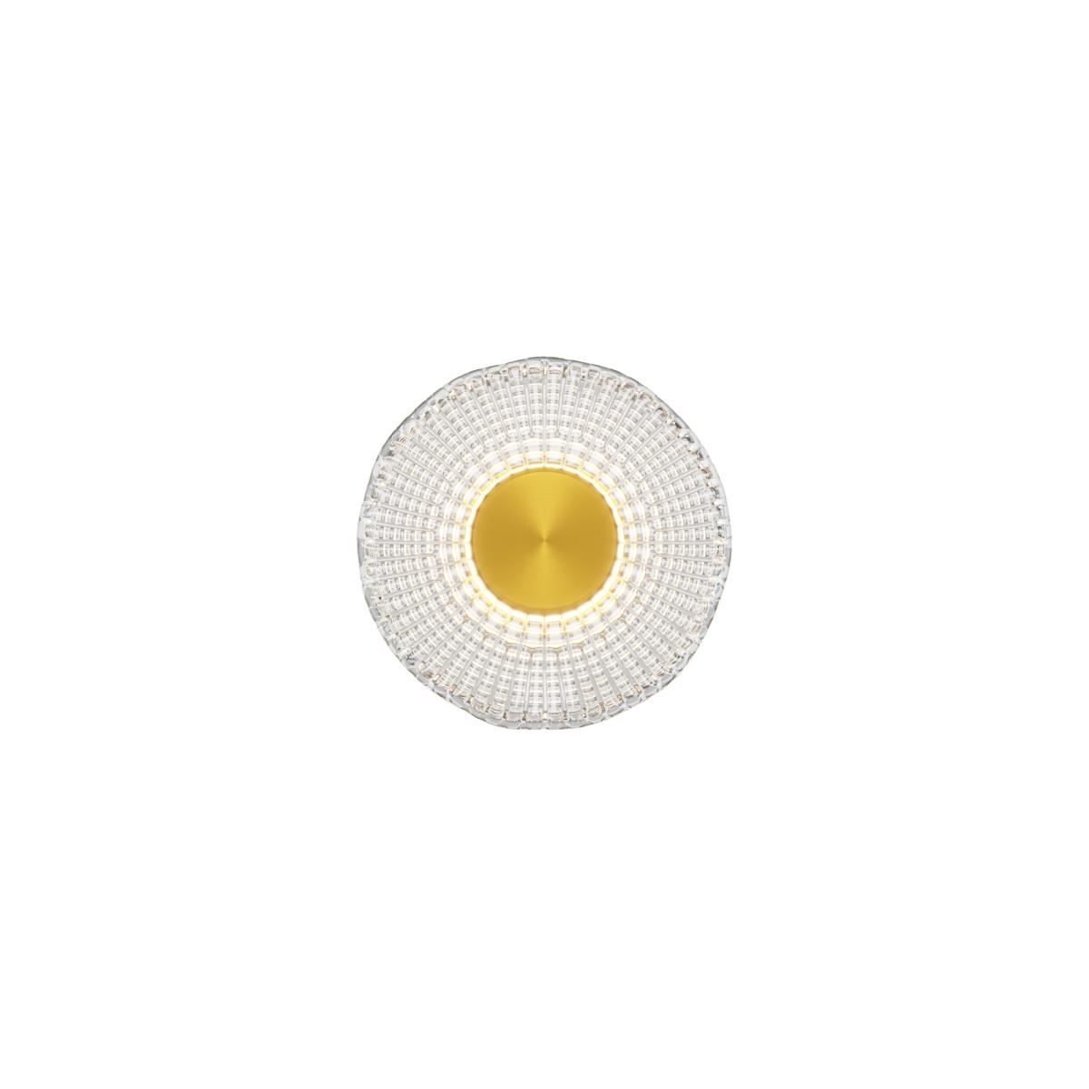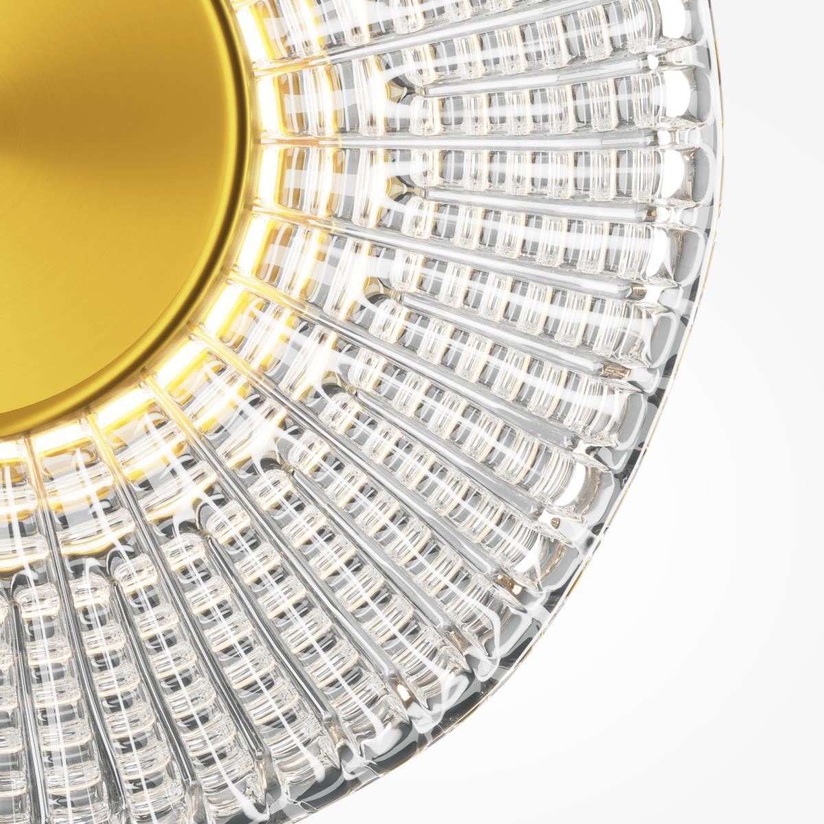 Металлическая арматура, цвет - латунь. Декоративные плафоны из литого стекла. Они рассеивают свет и дают легкие блики на стенах. Стекло плафонов может быть прозрачным или тонированным с паттерном молочного оттенка. Встроенный LED-источник света имеет цветовую температуру 3000 К, угол рассеивания — 120 градусов.