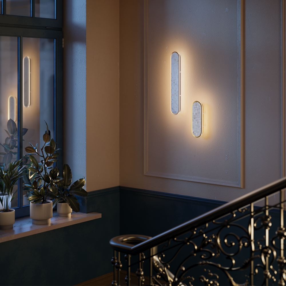 Контраст текстур — переливы перламутра и матовая поверхность металла цвета латуни. LED-лента под акриловым рассеивателем создаёт ореол на стене. Рядом с драйвером установлен переключатель (2700-3000-4000K), который позволяет установить температуру света при монтаже.