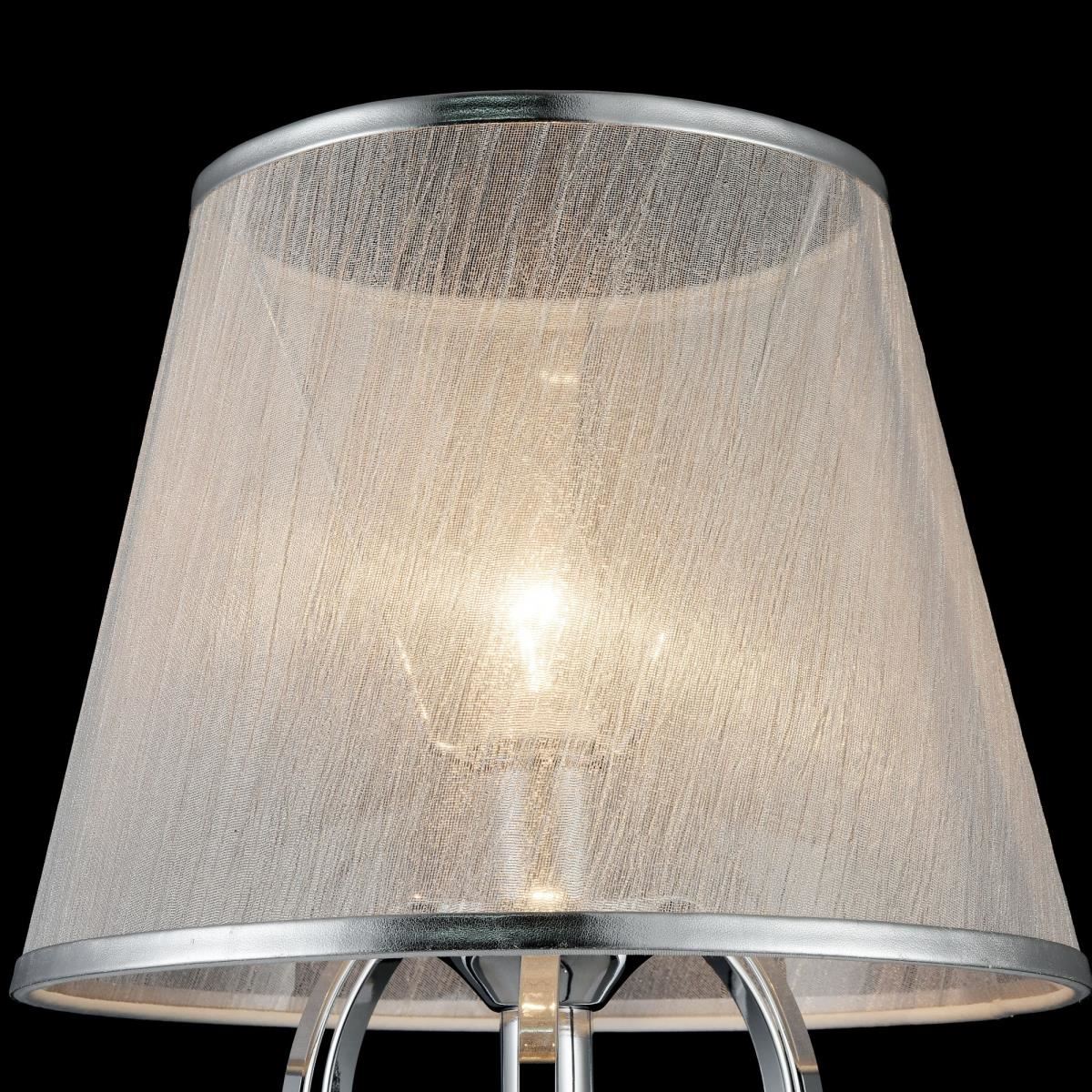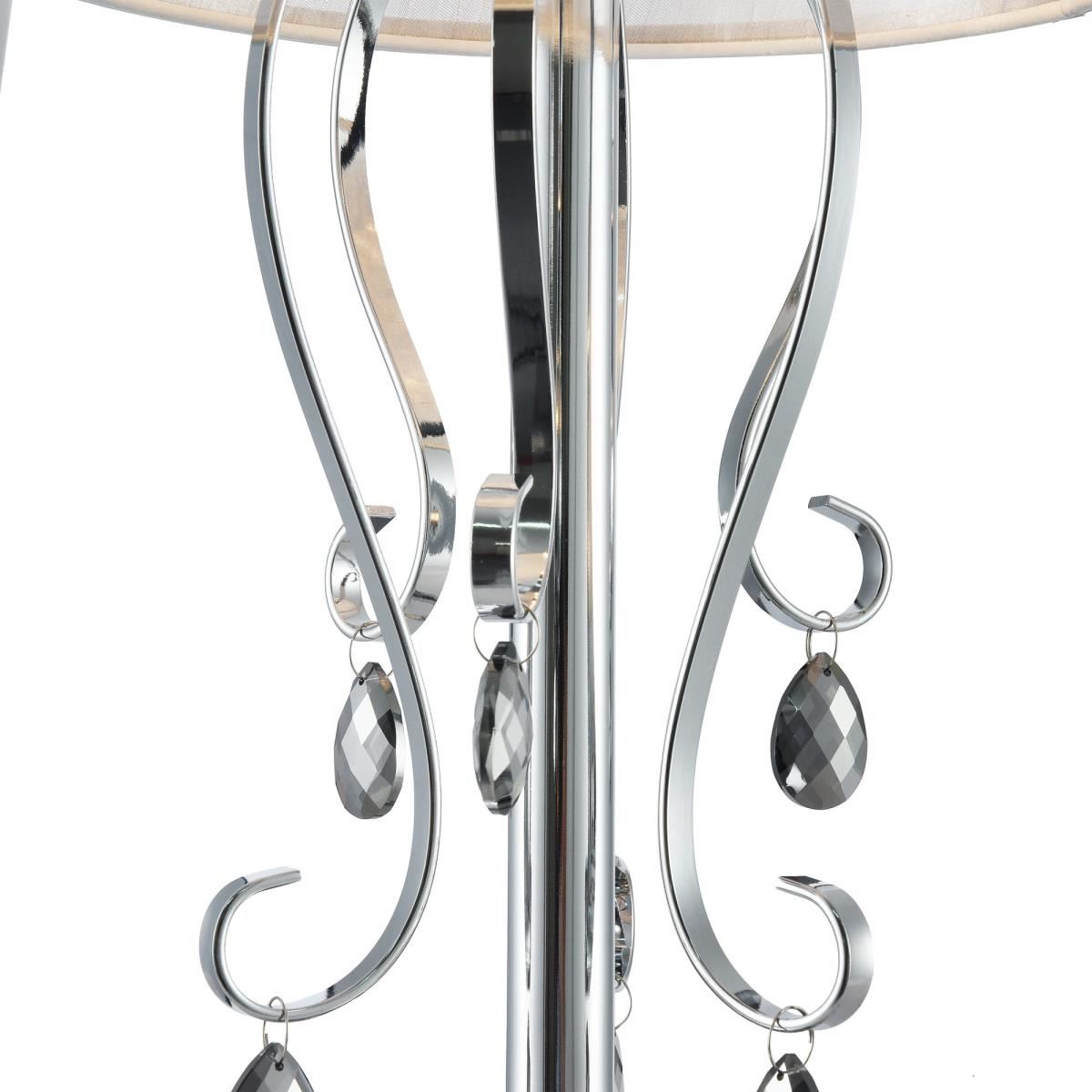 Абажуры и арматура светильников выполнены в разных цветах, с несколькими видами арматуры. Основание люстры украшено стеклянным декоративным элементом, а завитки рожков украшают подвески.