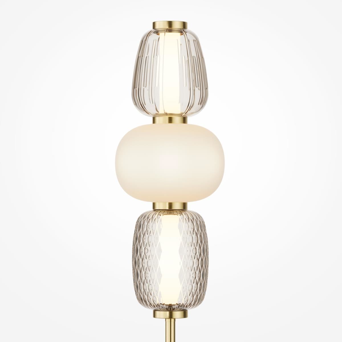 Металлическая арматура, цвет - золото, хром. Микс плафонов округлых и вытянутых форм из белого матового и прозрачного стекла с сетчатым и с линейным повторяющимся рельефным рисунком. Регулируемая высота подвесных моделей, провод - 3 метра. LED-источник света, цветовая температура 3000К.