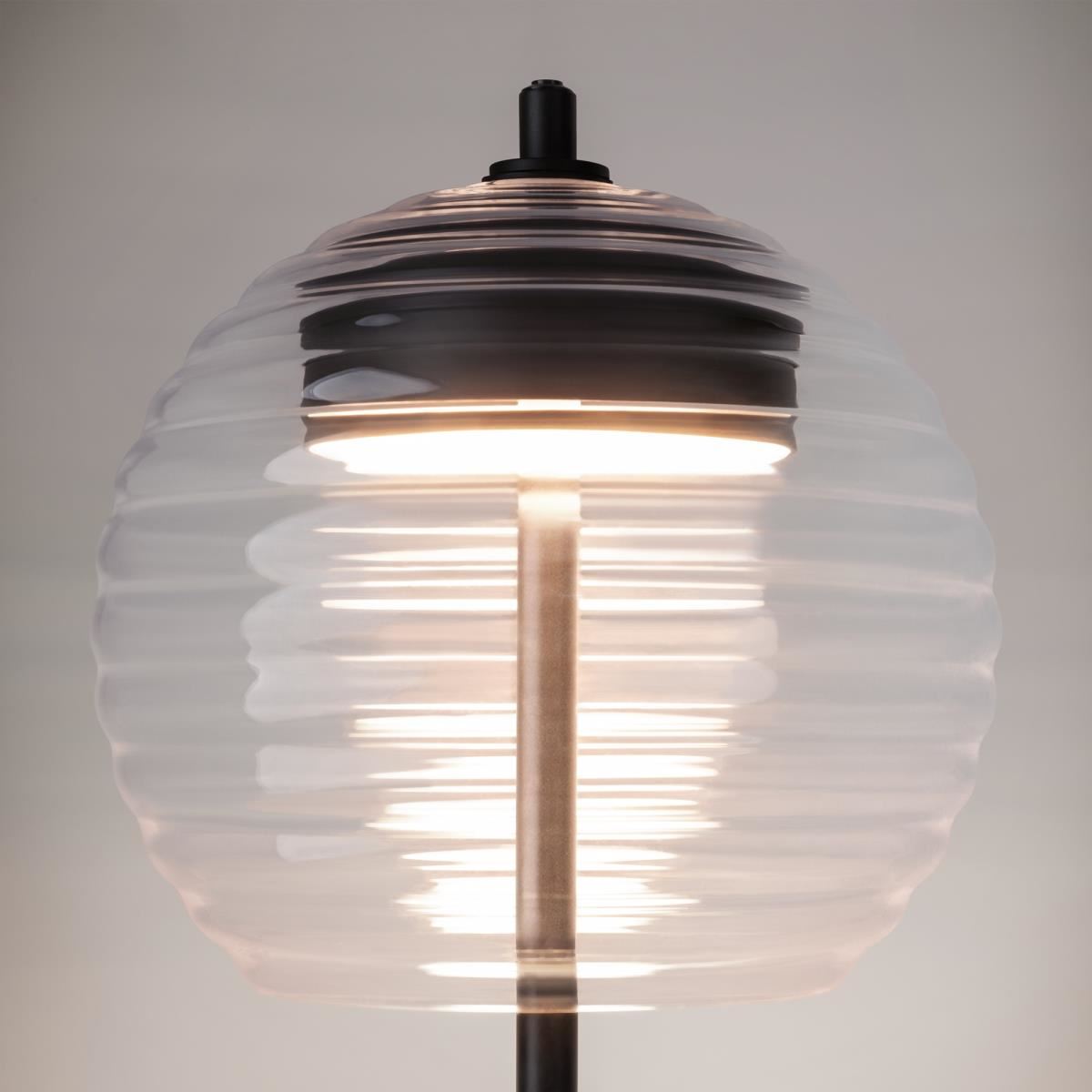 Арматура из металла, оттенки – никель, латунь, матовый черный. Плафон-сфера из прозрачного стекла с рельефным рисунком. Источник света установлен в металлическом корпусе сверху. Регулируемая высо