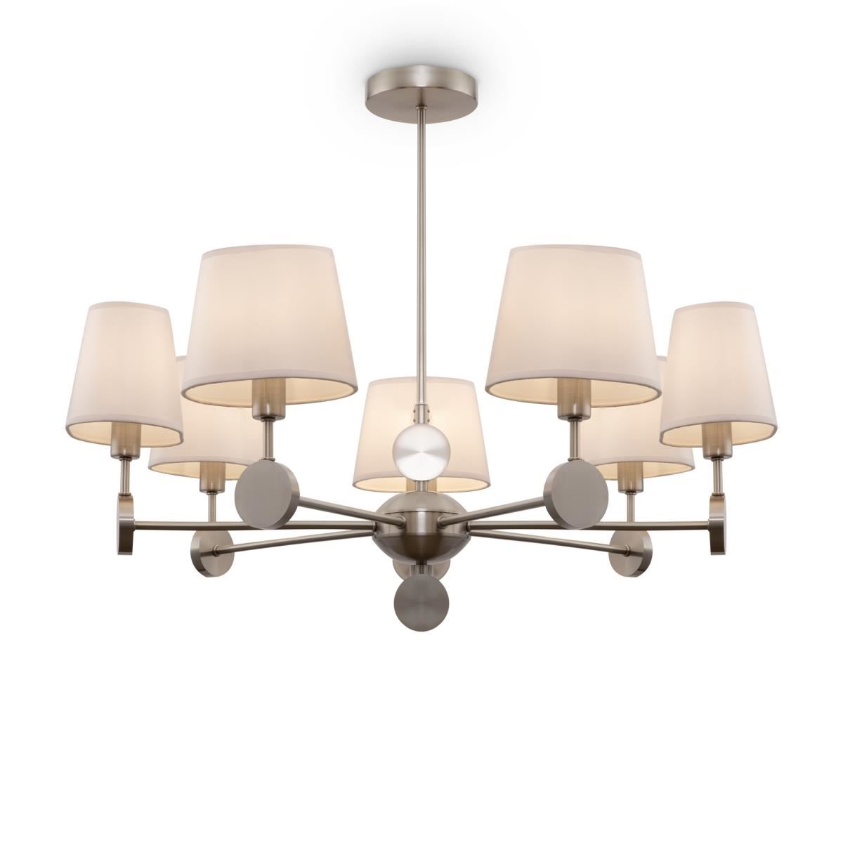 Эклектичный дизайн позволяет серии Soho гармонично сочетать мотивы неоклассики и современные конструктивистские идеи. Привлекает внимание актуальная форма металлической арматуры, сочетающей четкие линии с округлыми элементами. Цвет никеля прекрасно оттеняют сатиновые абажуры необычного дизайна. Их вытянутая форма идеально дополняет геометрию светильников. Игра цвета в округлых элементах светильника дарит праздничные блики и переливы. Серия легко адаптируется как в классических, так и в современных интерьерах, оформленных в стиле mid-century modern, неоклассика, контемпорари. Широкий ассортимент включает люстры на 7, 5 и 3 плафона, одиночный подвес, настольную лампу и бра. Все светильники снабжены цоколем для ламп Е14.