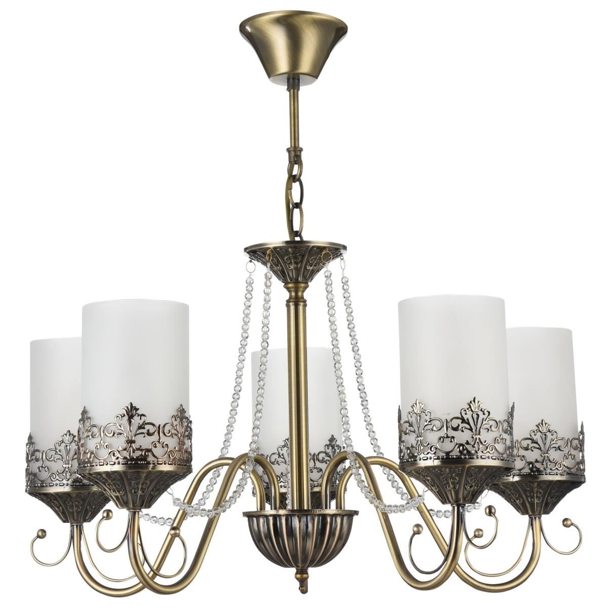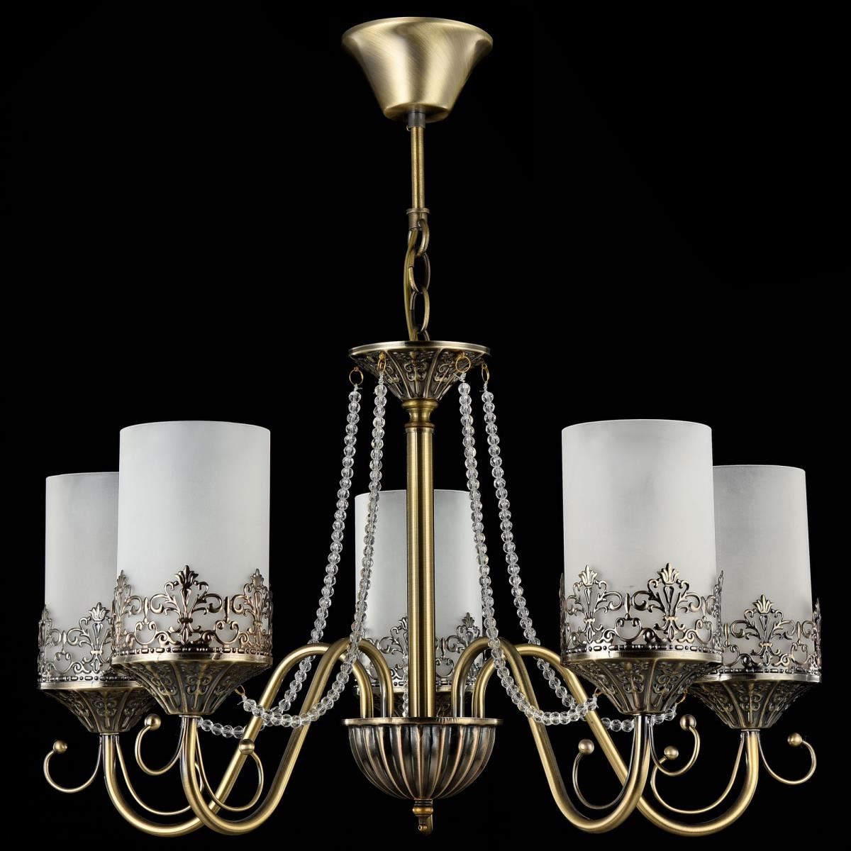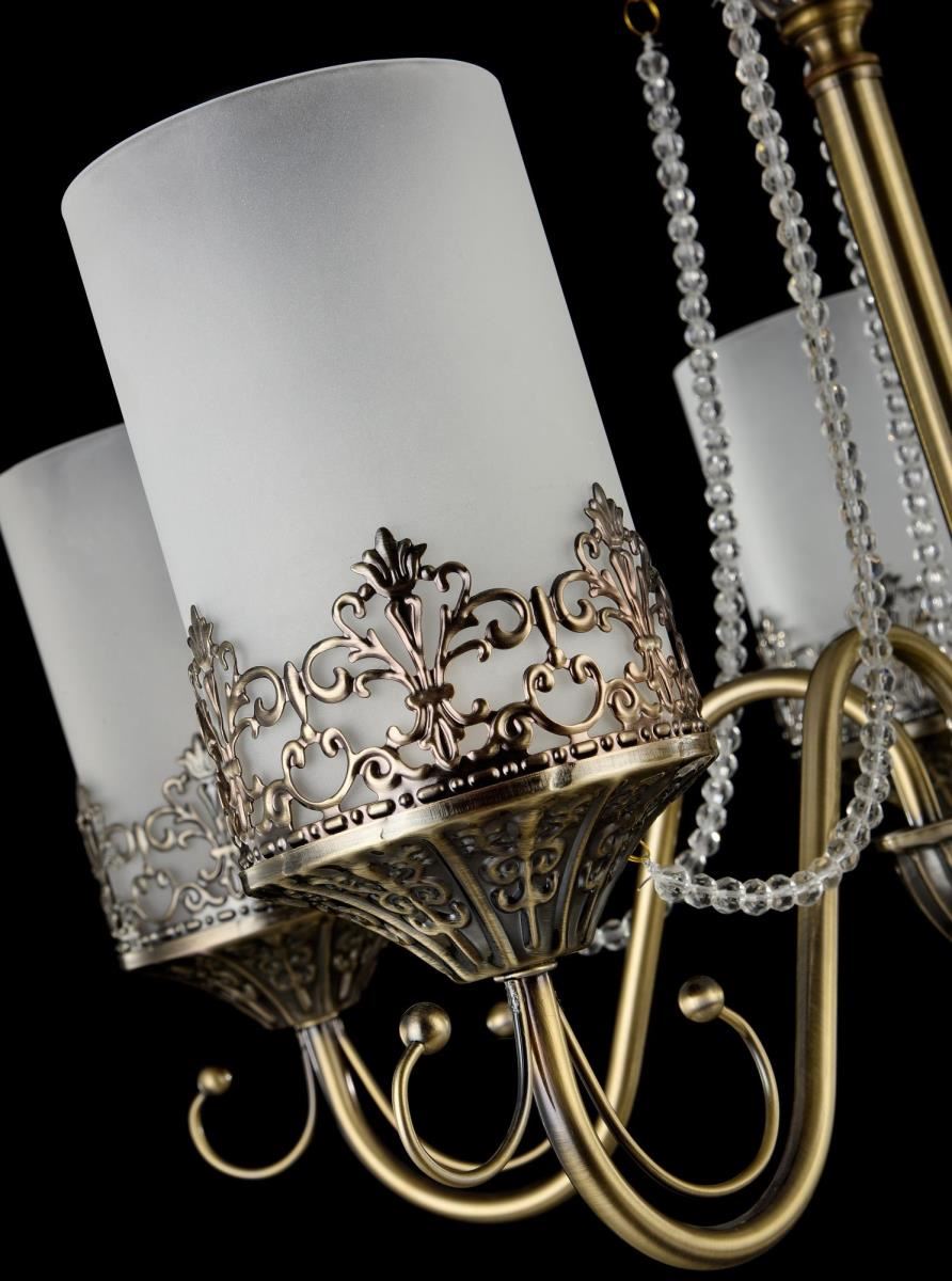 Нарядные и стильные светильники – прекрасное решение для интерьеров в современном стиле. Металлическая арматура окрашена в бронзовый цвет, плафоны из матового стекла в виде "свечек". Основание изделий и розетки украшены объемным орнаментом. Также светильники дополнены подвесками.