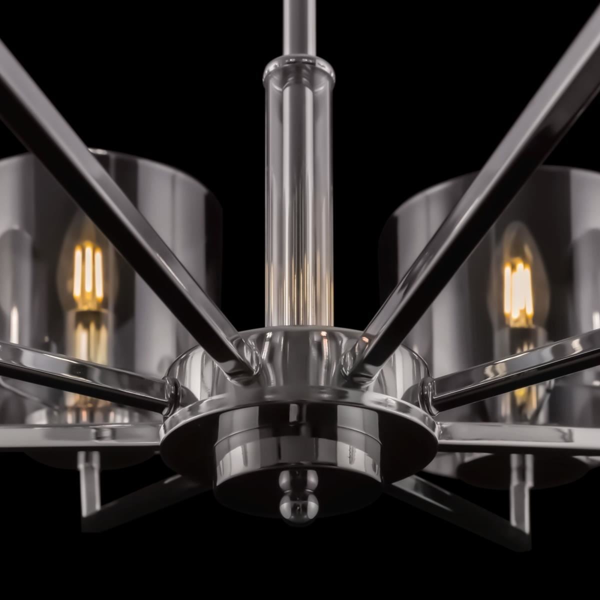 Серия Karen из хромированного метала и стекла выполнена в стиле минимализм. Стеклянные дымчатые плафоны дополнены гальваническим напылением, которое придает стеклу зеркальный эффект при выключенном освещении и делает его ярким и сияющим при включенном режиме. Плафоны имеют форму цилиндра и не закрыты сверху и снизу, что позволяет избежать скопления пыли. Плафоны крепятся на скобы, что позволяет быстро и легко их снимать и одевать. Высота люстры регулируется длиной цепи.