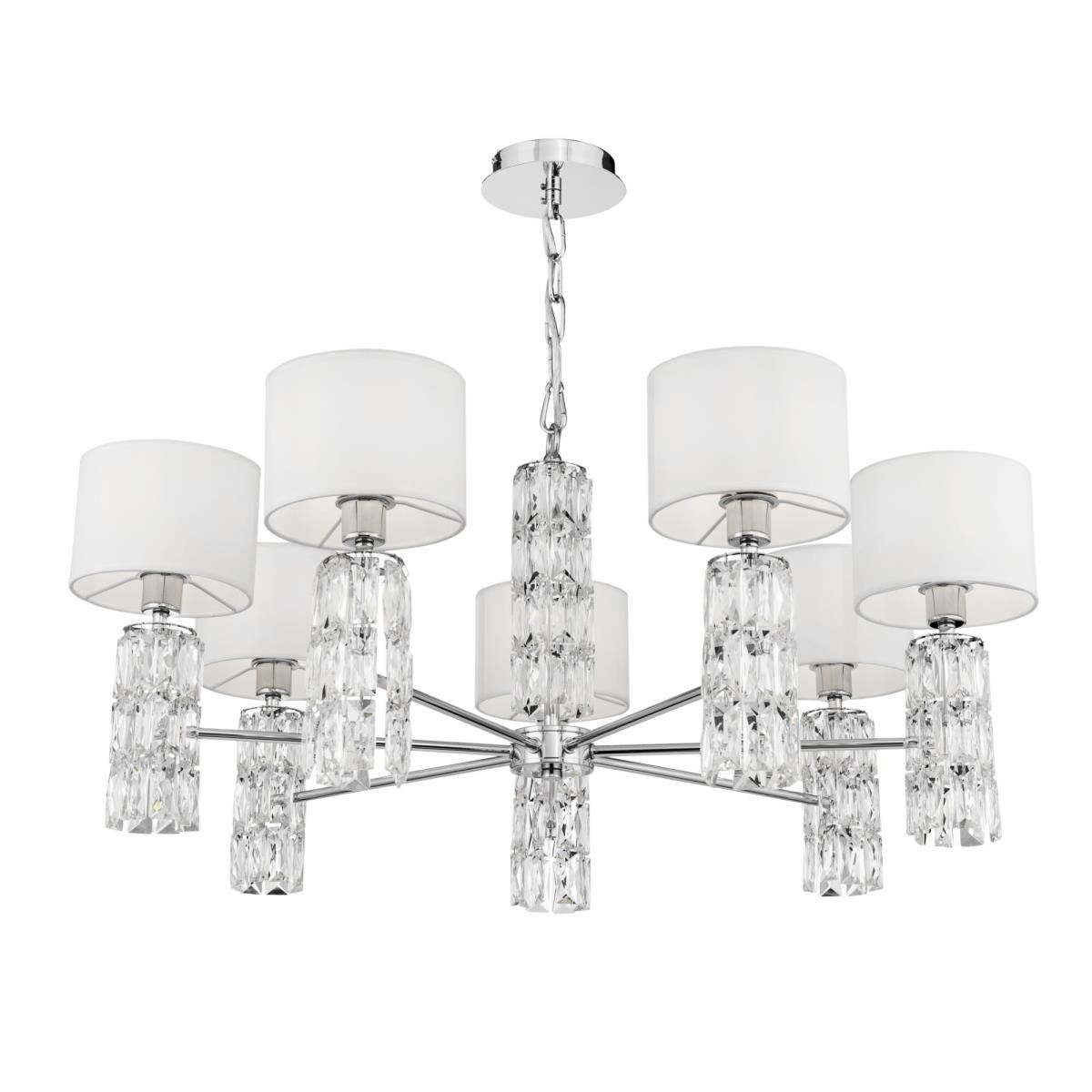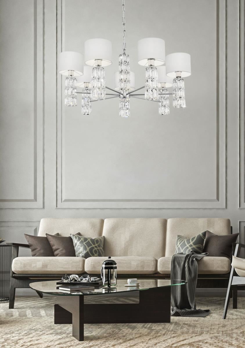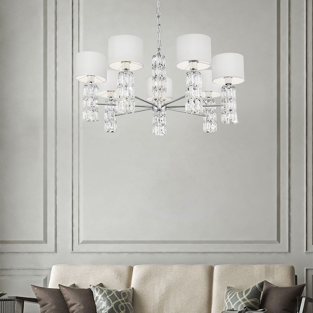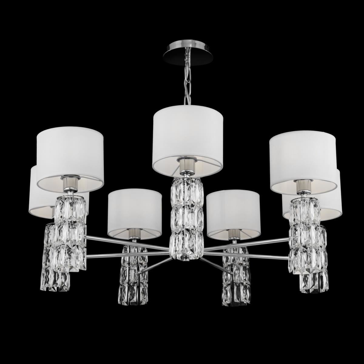 Подвески из массивных граненых кристаллов на рожках и в основании делают серию Talento непохожей на других. Арматура изготовлена из металла с хромированным покрытием. Абажуры сделаны из белой ткани, нанесенной на ПВХ. Высота люстр регулируется длиной цепи. Широкая линейка светильников, представленных в серии, включает люстру на 7 и 5 плафонов, несколько бра и настольных ламп, торшер— это идеально сформированный, выдержанный комплекс для подсветки интерьеров в стиле неоклассика, ар-деко, модерн.
