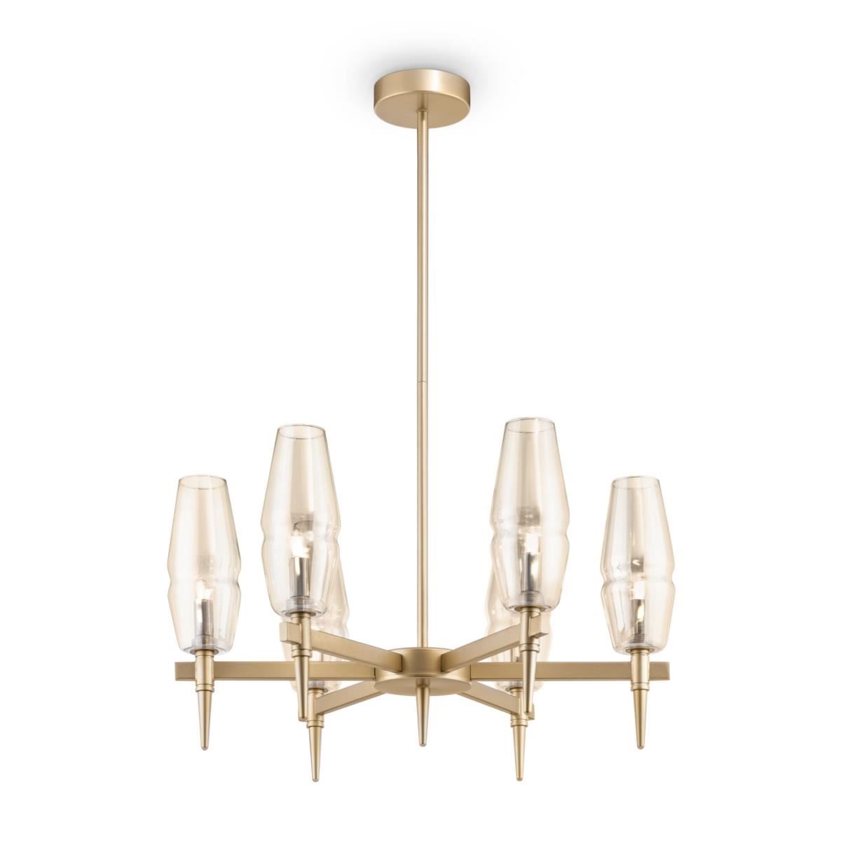 Необычная форма плафонов, сделанных из выдувного стекла, навеяна дизайнеру этническими мотивами. Плафоны – прозрачные, арматура – матовое золото. Высоту люстр возможно варьировать числом составных частей центрального штока.