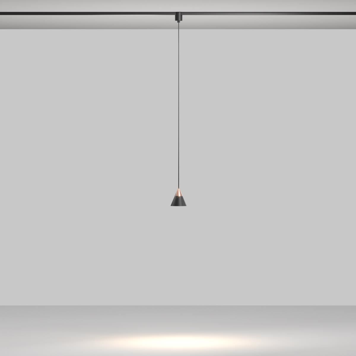 Подвесной светильник необычной конической форме. Материал корпуса - алюминий, цвет - черный. Декоративная металлическая вставка у основания в медном оттенке. Коническая форма обеспечивает смягчение светового потока и узкий угол рассеивания, который составляет 38 градусов. Коэффициент цветопередачи составляет более 90, что позволяет максимально передавать оттенки в помещении.