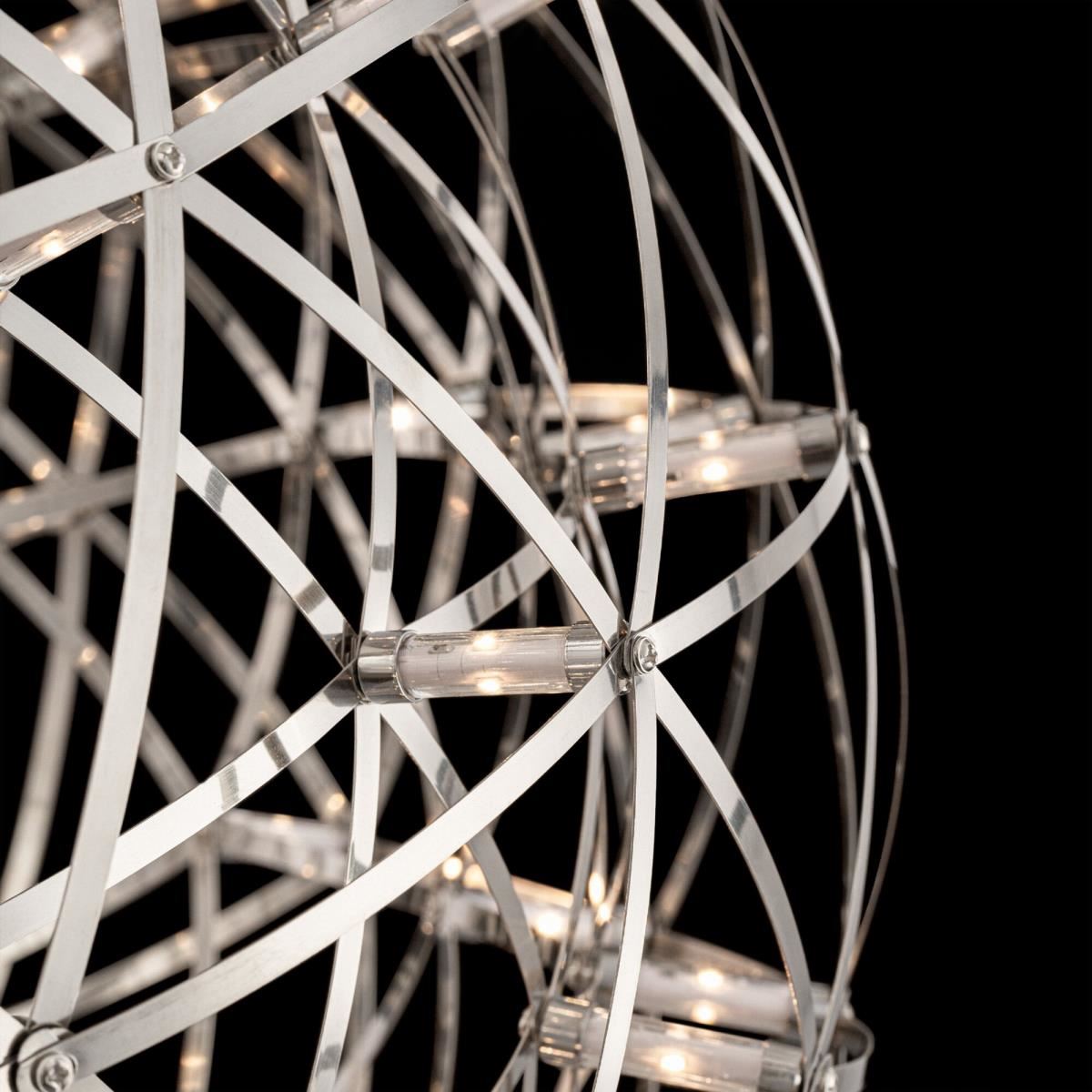 Серия Amber представляет воздушные светильники-сферы, выполненные в трендовом стиле хай-тек. Хромированная металлическая арматура и плафон, сотканный из переплетающихся лент, создают запоминающийся современный образ. Встроенные светодиоды экономят электроэнергию и красиво подсвечивают сферу. В выключенном состоянии светильник выглядит как абстрактное произведение искусства и является полноправной частью декоративного ансамбля интерьера. Серию составляют подвесы различного диаметра – их можно использовать по отдельности, а можно комбинировать в группы. Для обстановки в стиле хай-тек, минимализм, лофт, помещений кафе и ресторанов светильник станет идеальным решением.