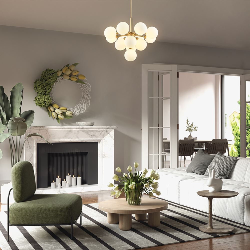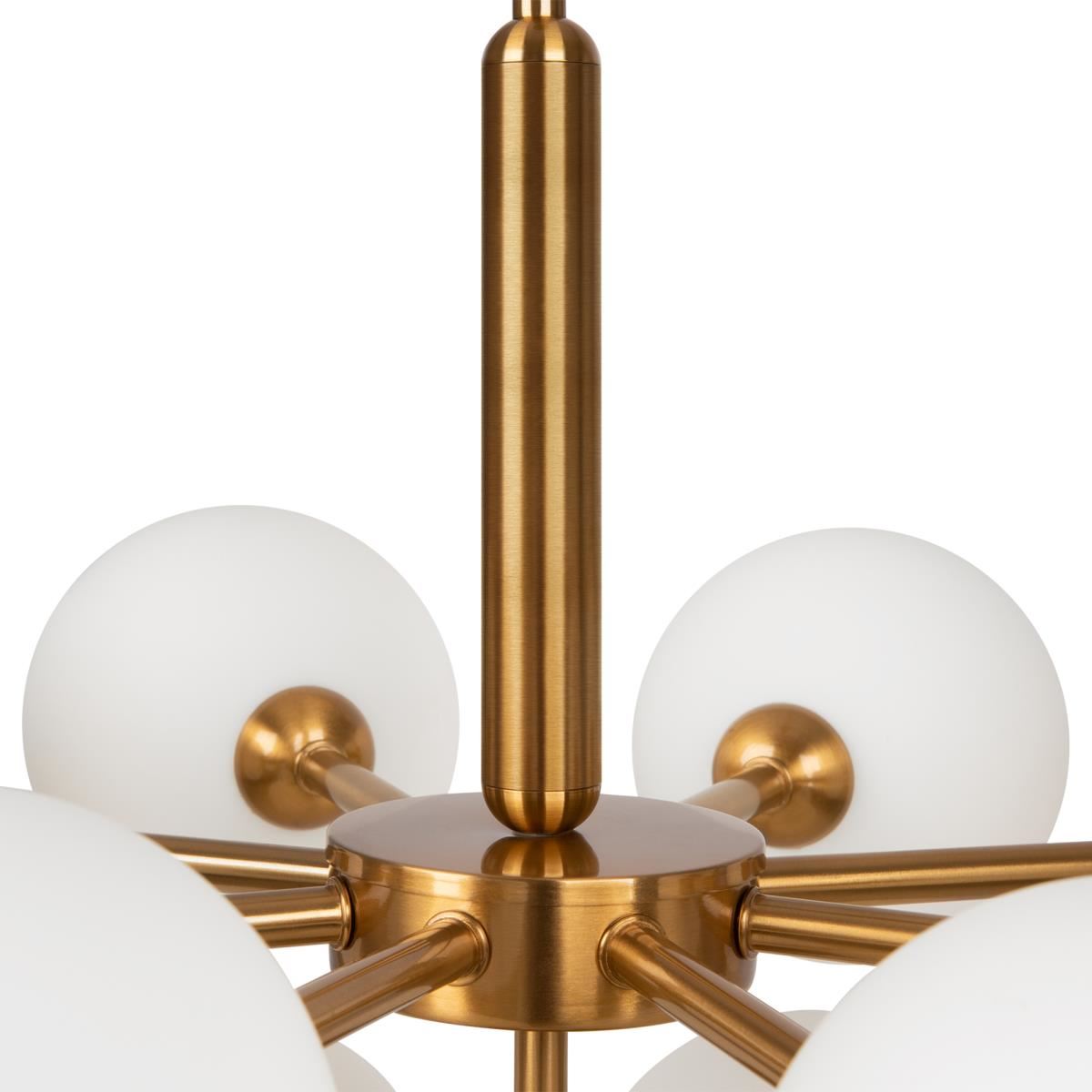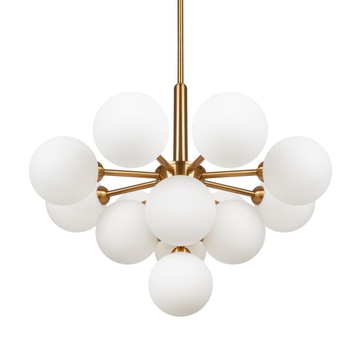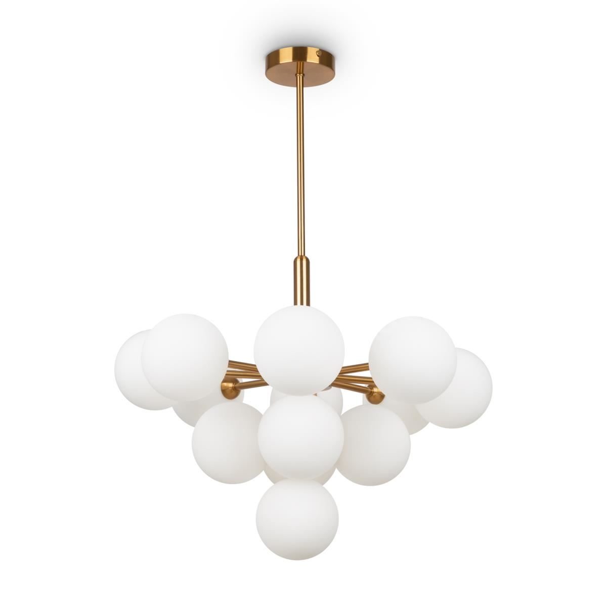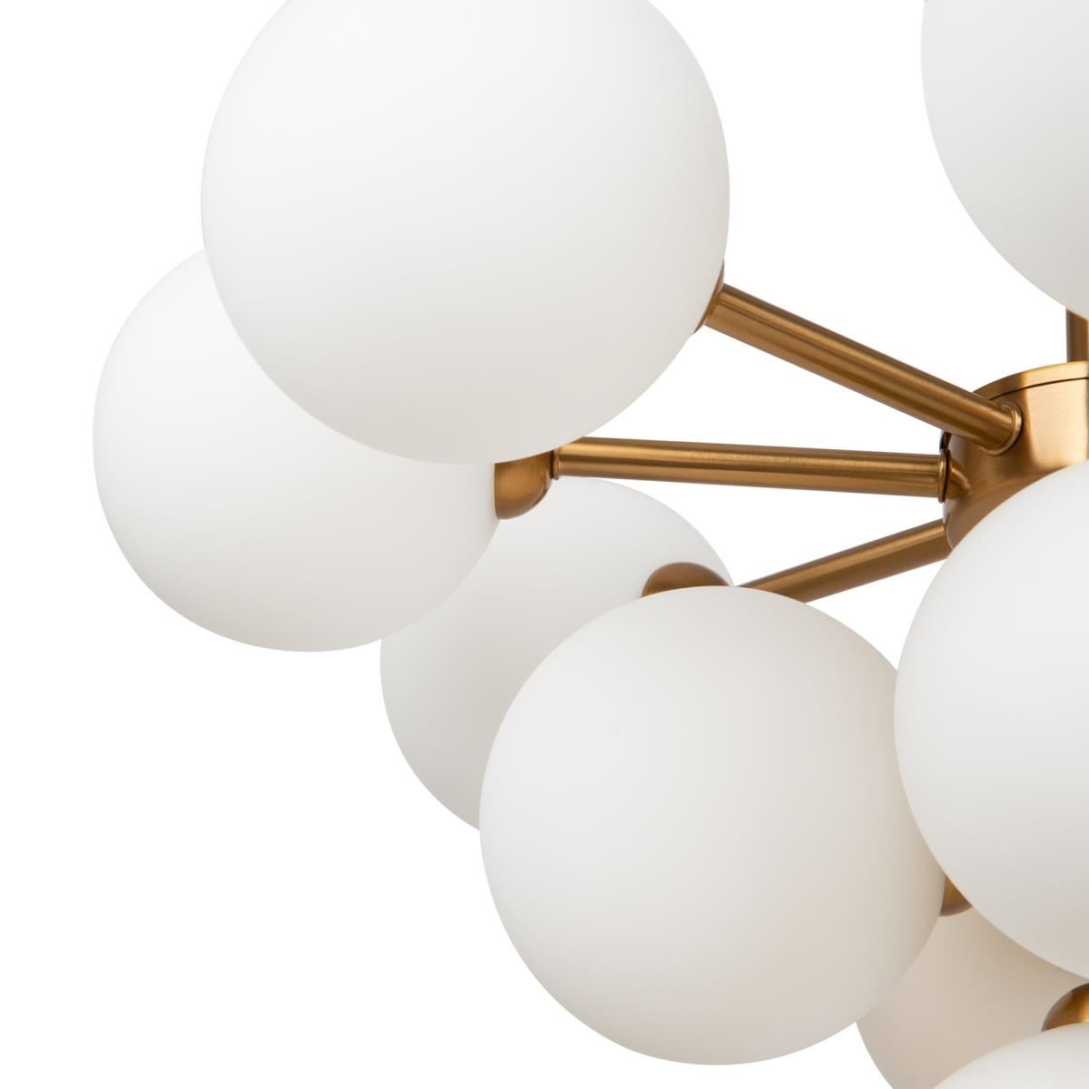 Округлые плавные линии и трендовые плафоны-сферы – беспроигрышное сочетание для современных интерьеров. Металлическая арматура светильника выполнена в актуальном оттенке латуни. Аскетичный силуэт подчеркнут шаровидными плафонами из матового белого стекла. Серия, объединившая эстетику mid-century modern и лаконичный минимализм, включает люстру на 13 плафонов, бра и настольную лампу. Ассортимент подходит для общей и зональной подсветки, а при желании – легко комбинируется с любыми моделями, оснащенными сферическими плафонами. Элегантные светильники дополнят пространство спальни, гостиной или кабинета, оформленных в стиле контемпорари, модерн, ар-деко, сканди, конструктивизм._x000D_