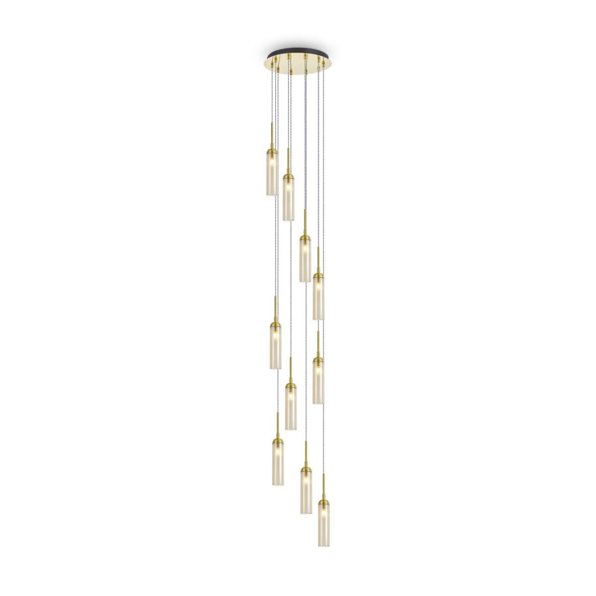 Арматура из металла, цвет — золото. Рельефные плафоны в тренде ZIGZAG. Материал — стекло, цвет — янтарный. Высота подвесных светильников регулируется. Плафоны закреплены на металлическую сферу. Источник света — лампа с цоколем G9.