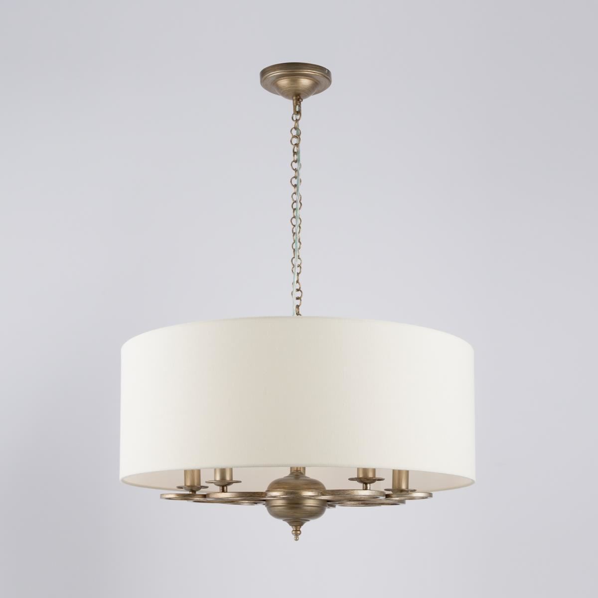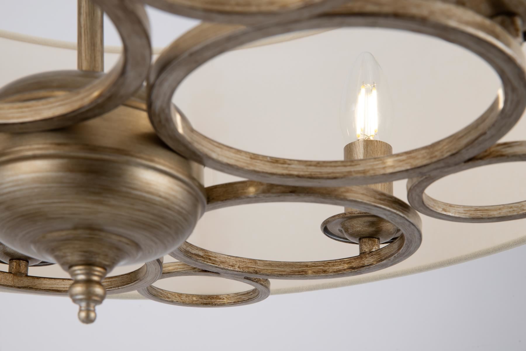 Композиция из металлических колец разного диаметра образовывает каркас и одновременно является декором светильников серии Anna. Единый абажур подвесных светильников накрывает сразу все лампы и мягко рассеивает их свет. Арматура выкрашена в цвет золотой антик, что добавляет деталям визуального объема и ценности. Высоту подвесных светильников возможно регулировать длиной цепи.