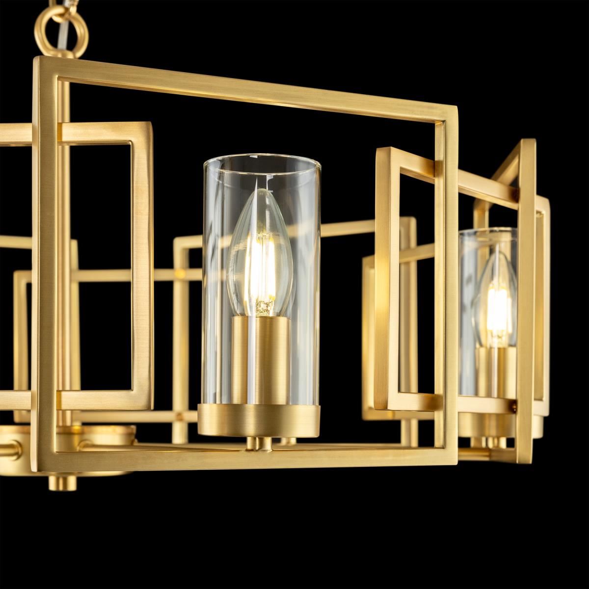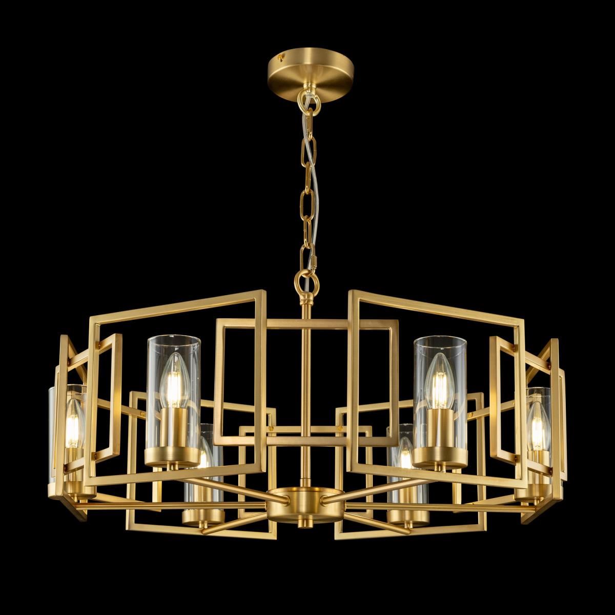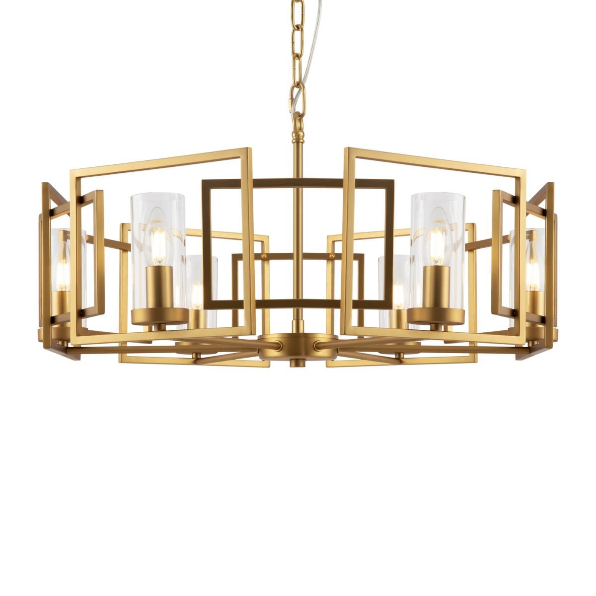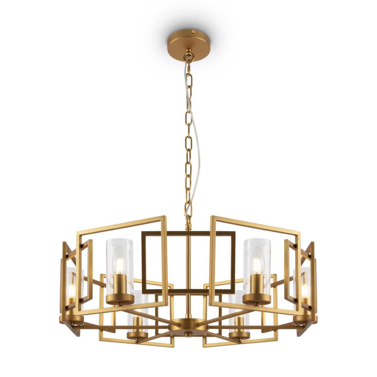 Геометрическую иллюзию создает каркас из наложенных друг на друга металлических рамок разного размера. Замкнутый в кольцо, он объединит конструкцию в единое целое и несет на себе плафоны из прозрачного стекла с размещенными внутри них лампами. Светильники серии покрашены в золотой цвет. Универсальное крепление "2 в 1" позволяет монтировать люстры с использованием цепи или без нее.