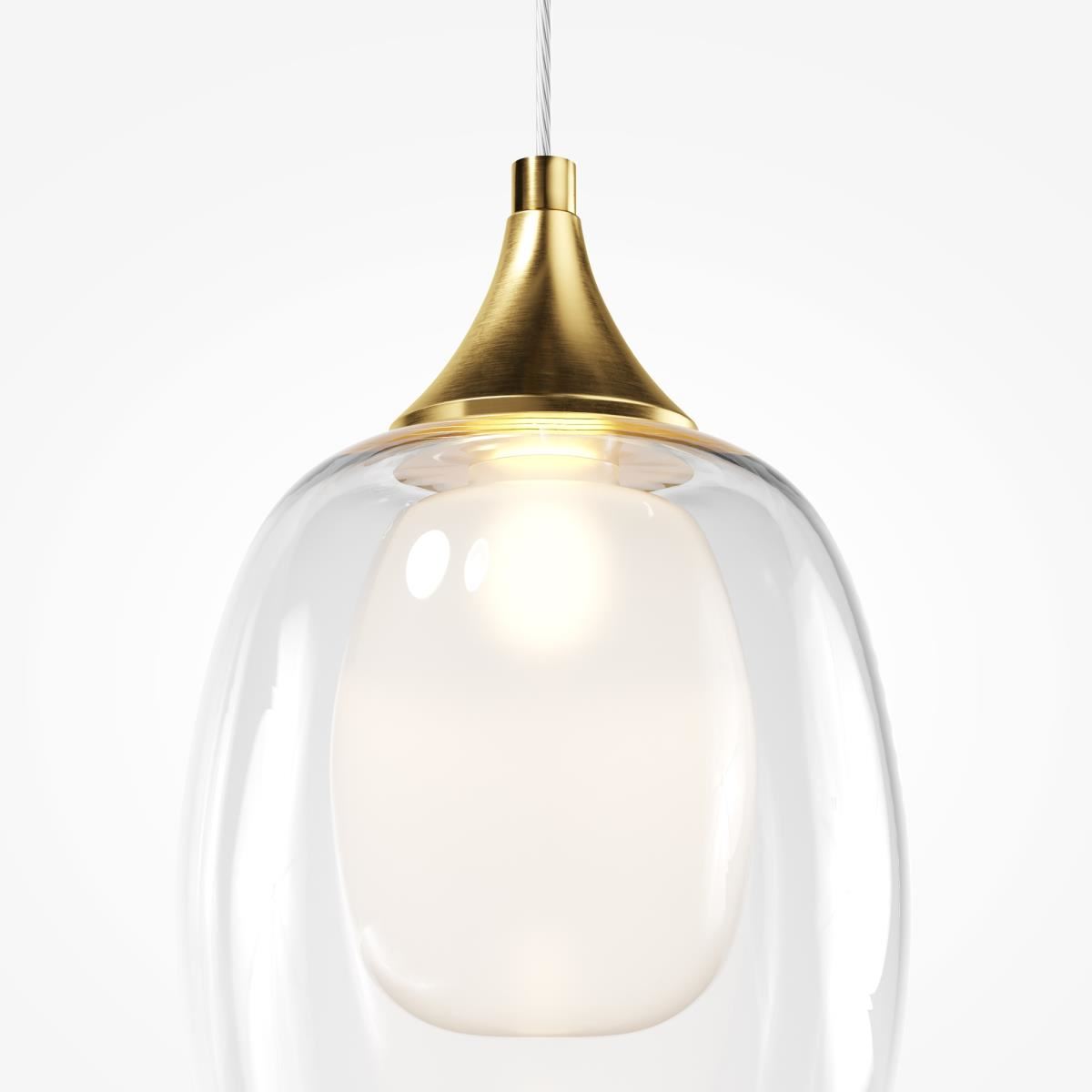 Металлическая арматура, цвет – латунь. Плафоны – двойное выдувное стекло. Внутренняя часть – матовая, внешняя – прозрачная. Элегантная неоклассика, трендовые округлые формы.