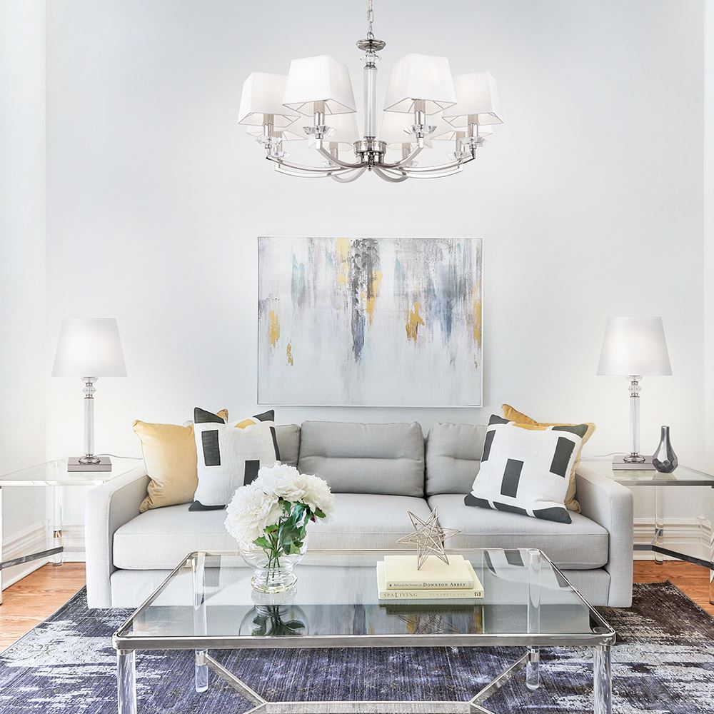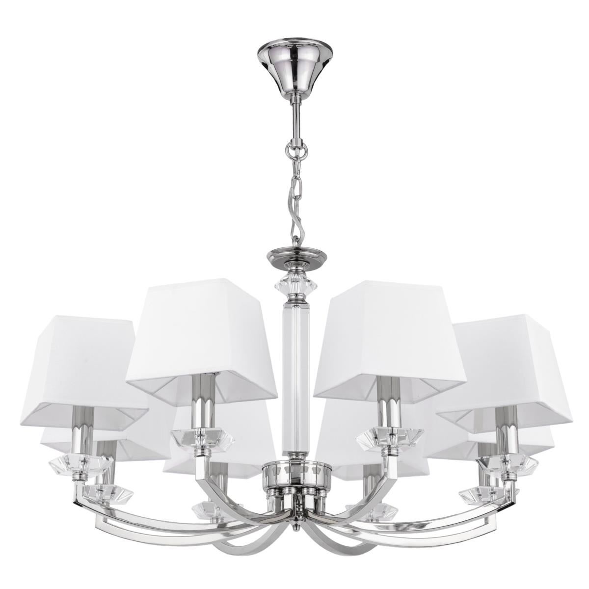 Светильники серии Chandler характеризуются остротой углов и четкостью линий. Арматура изготовлена из металла и покрыта хромом. На рожках квадратного сечения установлены абажуры из ткани на ПВХ трапециевидной формы. Конструкция дополнена декоративными вставками из прозрачного литого стекла. Высоту люстр возможно изменить, регулируя длину цепи.