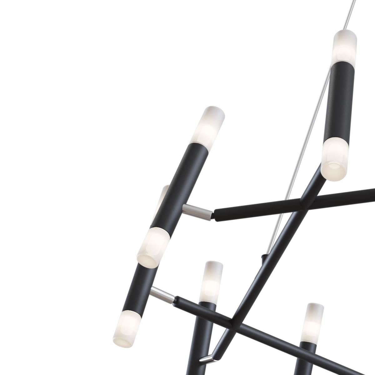 Динамичный дизайн светильников серии не останется незамеченным и станет эффектным акцентом в современном интерьере. Источники света размещены парно в цилиндрах-плафонах, каждый из которых закреплен на тонком металлическом каркасе и благодаря шарниру вращается на 340° по горизонтали и 90° по вертикали. Есть возможность видоизменять дизайн светильника, создавая уникальную композицию и формируя множество локальных сценариев освещения. Рассеиватели из матового стекла смягчают свет ламп и дарят комфортный световой поток. Каркас изготовлен из металла и выкрашен в черный матовый цвет. Серия содержит подвесные и потолочные модели, бра и торшеры. Все светильники оснащены цоколями для ламп G9. Комбинируйте их в группы для создания эксклюзивных световых сценариев.