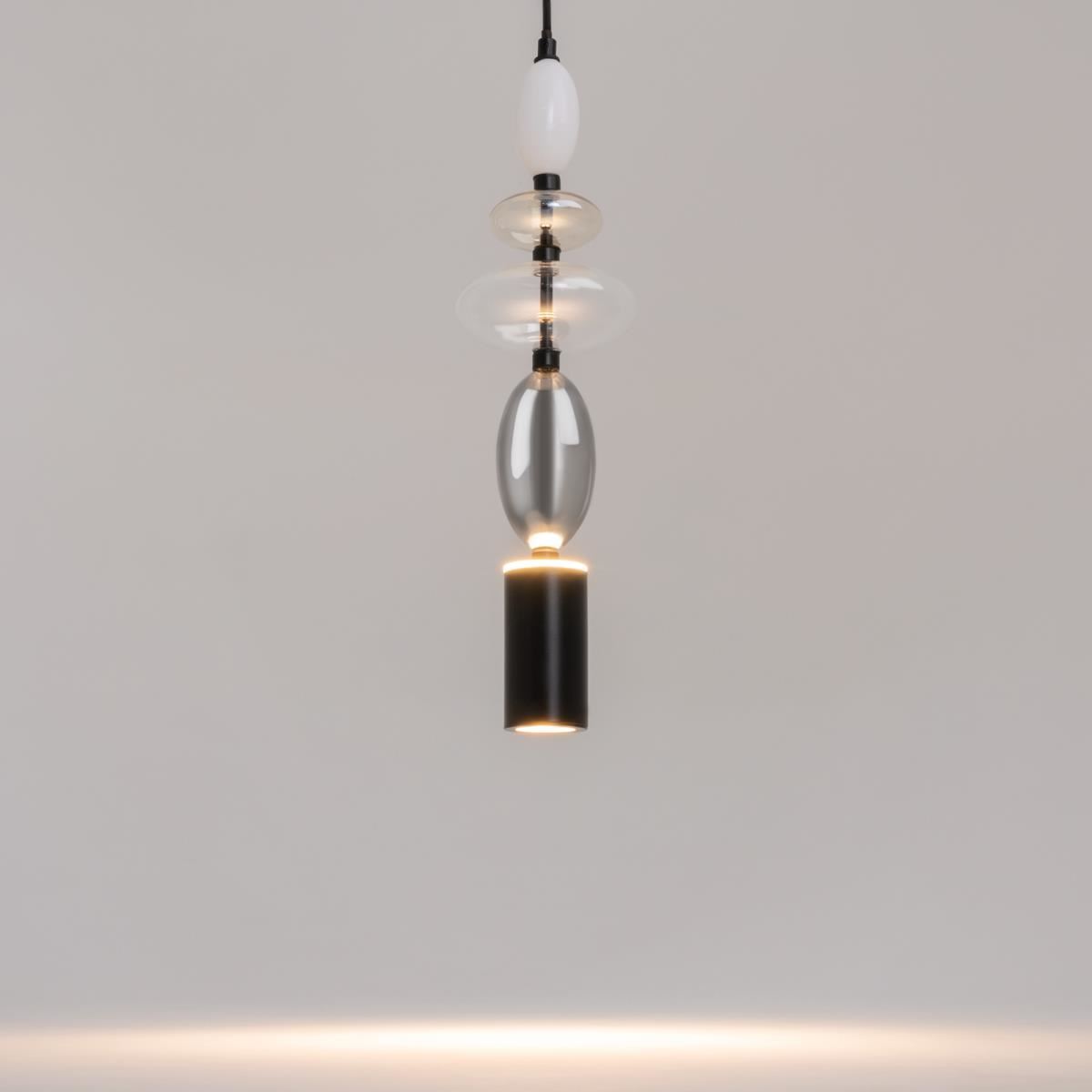 Черная металлическая арматура. Плафоны из стекла коньячного, белого, дымчатого цвета и прозрачный. Источник света комбинированный: нижний - съемная лампа с цоколем GU10, верхний - встроенный LED. Цветовая температура светильников 2700К, угол рассеивания света 120 градусов. Высота регулируется с помощью провода длиной 3 м. Монохромный дизайн, стеклянные элементы впишутся в различные стили интерьеров.