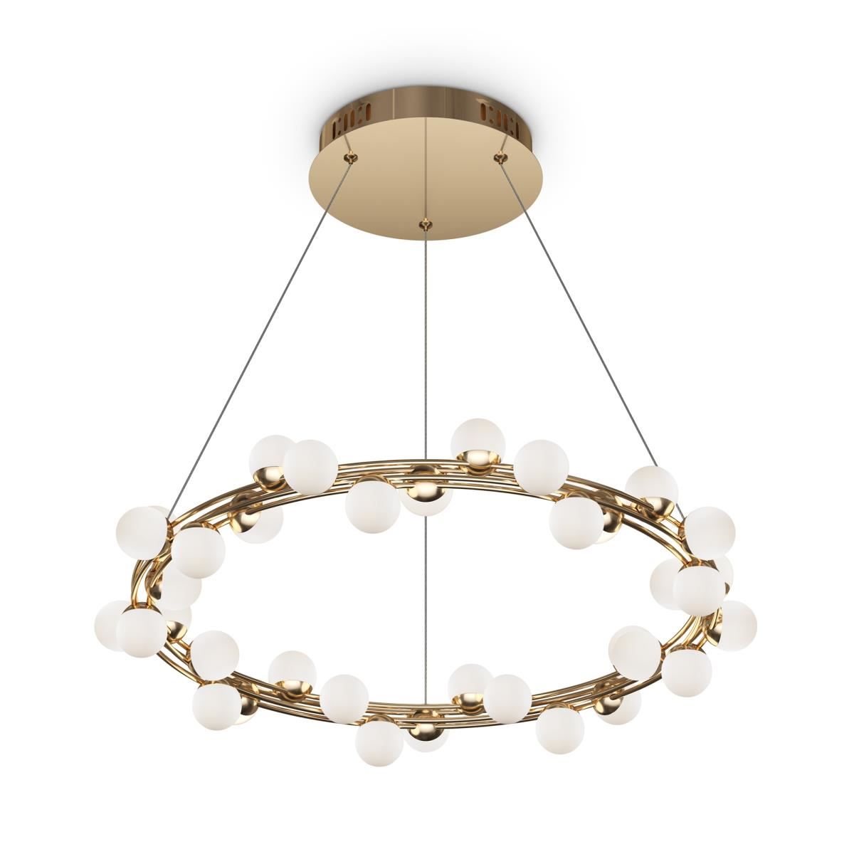 Широкая окружность, обрамленная «молекулами» света,обеспечивает максимально равномерное и яркое освещениепространства. «Атомный» или «молекулярный» дизайн,отражающий естество и природную сущность каждого предмета,не теряет актуальности и позволяет выгодно расставлять акцентыв интерьере. Одна из характерных черт подобных светильников—невесомость конструкции. За счет тонких, практически невидимыхтросов, которые регулируются по высоте, создается ощущение, что люстра парит в воздухе. Металлическая золотая арматура и матово-белые миниатюрные плафоны с легкостью дополнят любую палитру, а представленные в коллекции подвесная люстра и бра станут готовым ансамблем для освещения гостиной, спальни, прихожей.