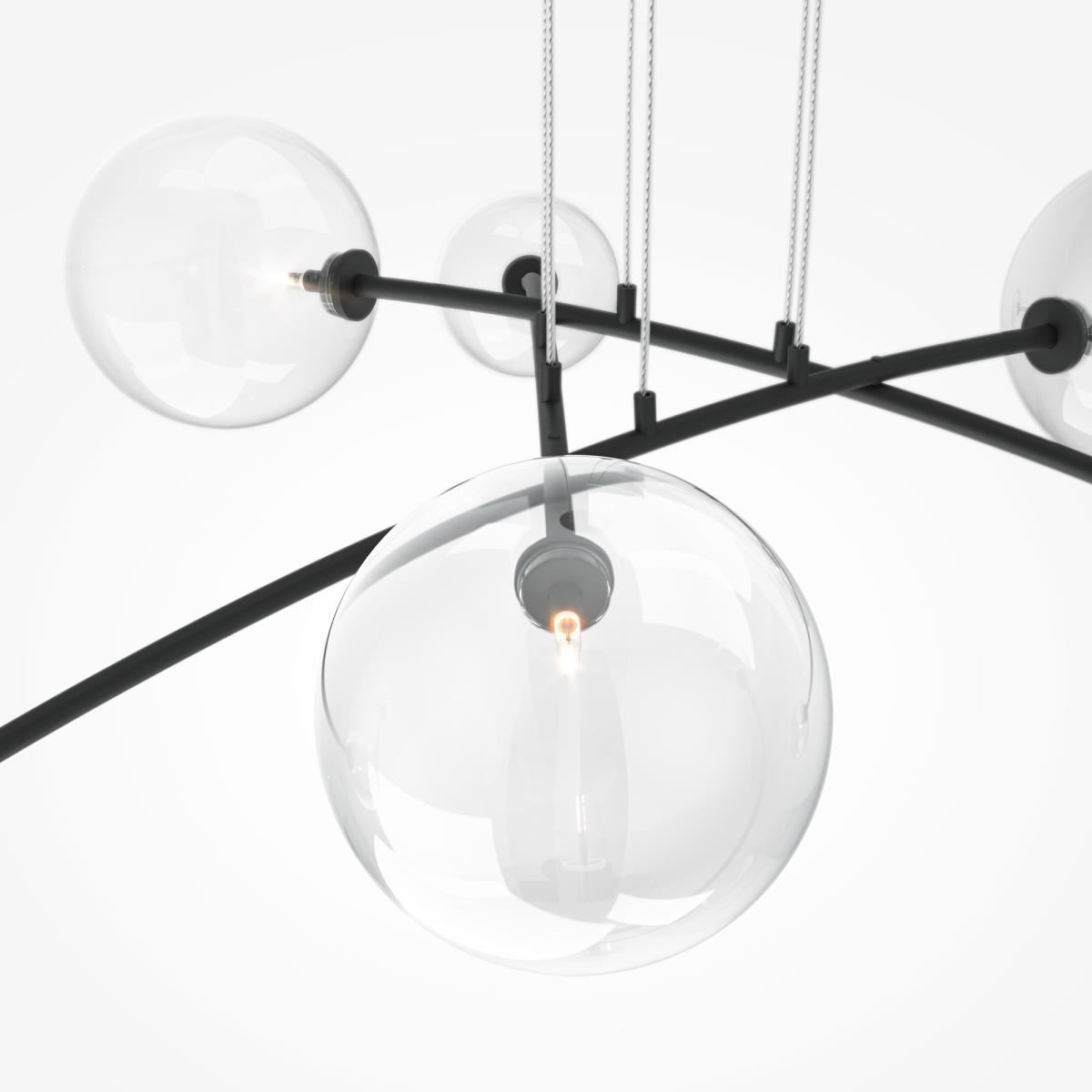 Материал арматуры - металл. Цвет - латунь, черный. Изящные линии арматуры, прозрачные плафоны из стекла в виде шара с миниатюрными лампами создают эффект воздушности светильников. Регулируемая высота подвесных светильников. Цоколь G4.