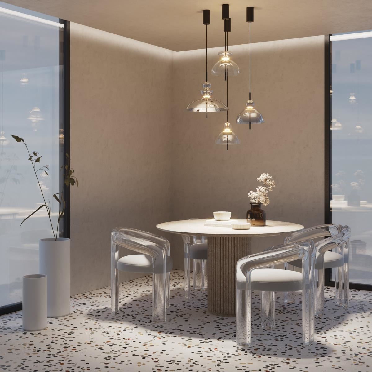 Материал арматуры - металл, цвет - черный. Уникальный дизайн минималистичных плафонов из стекла в трех цветах – дымчатый, прозрачный и серый. LED источник света, цветовая температура - 3000К. Регулируемая длина тросов.