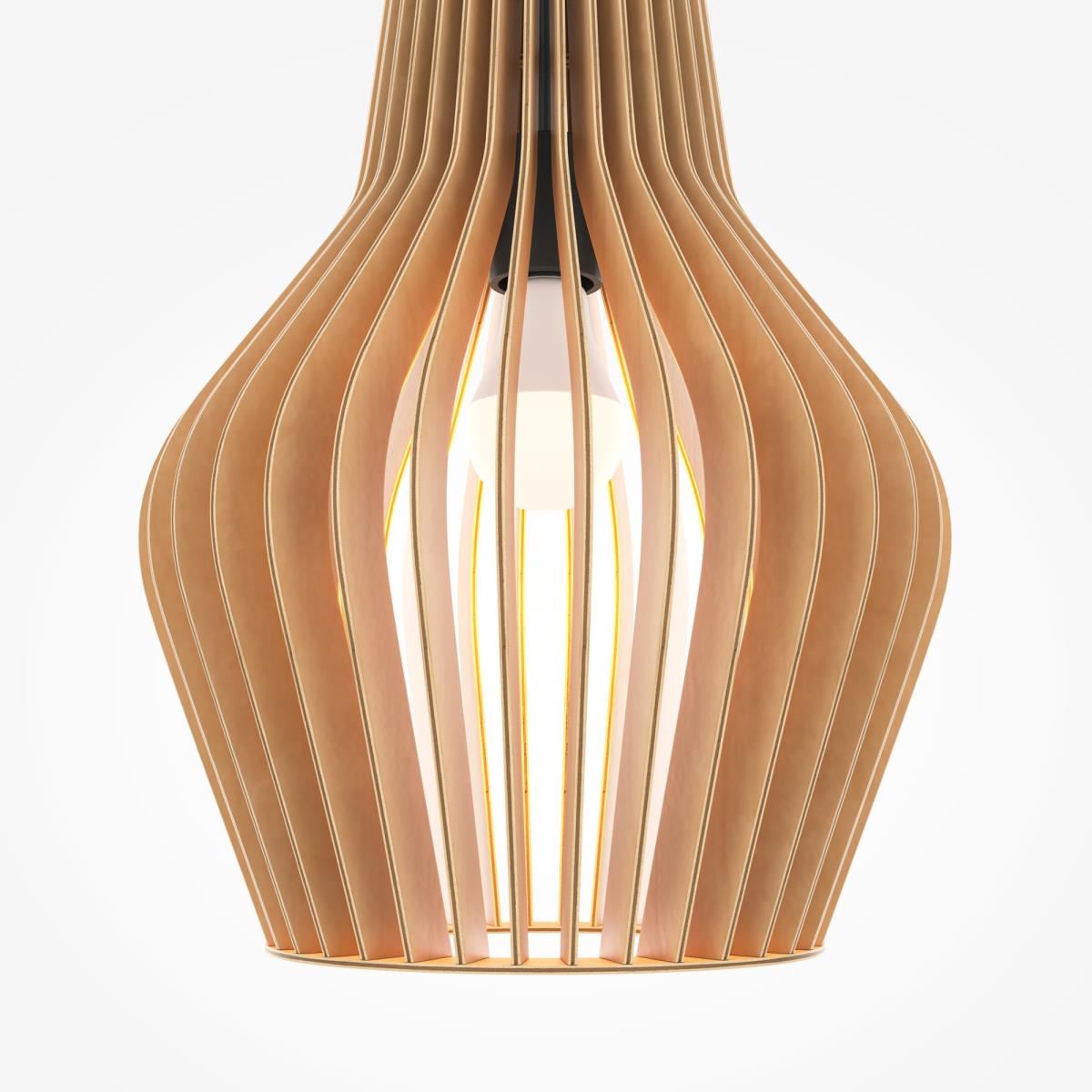 материал арматуры – металл, цвет – черный. Абажур – 5-ти слойная фанера бежевого оттенка, покрытая специальным лаком. Тканевый черный провод. Регулируемая высота. Простые лаконичные форма, природные материалы. Цоколь E27.