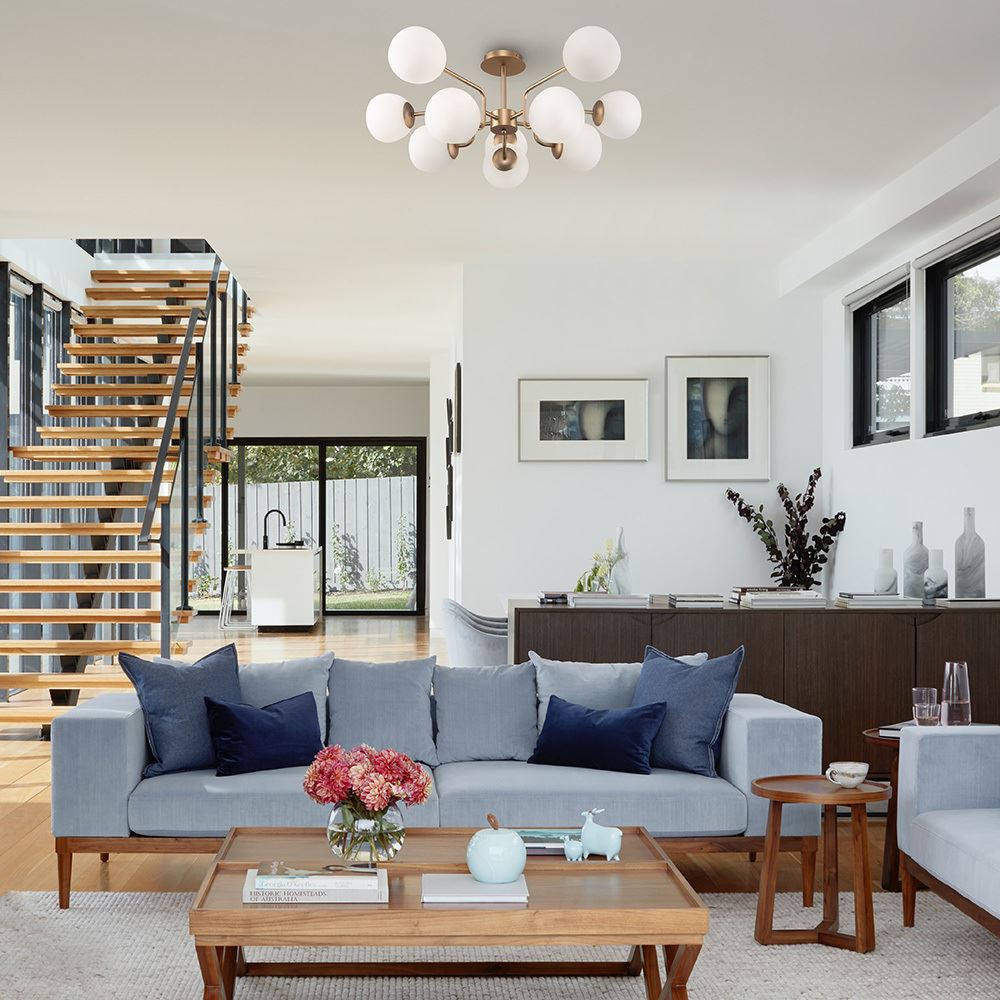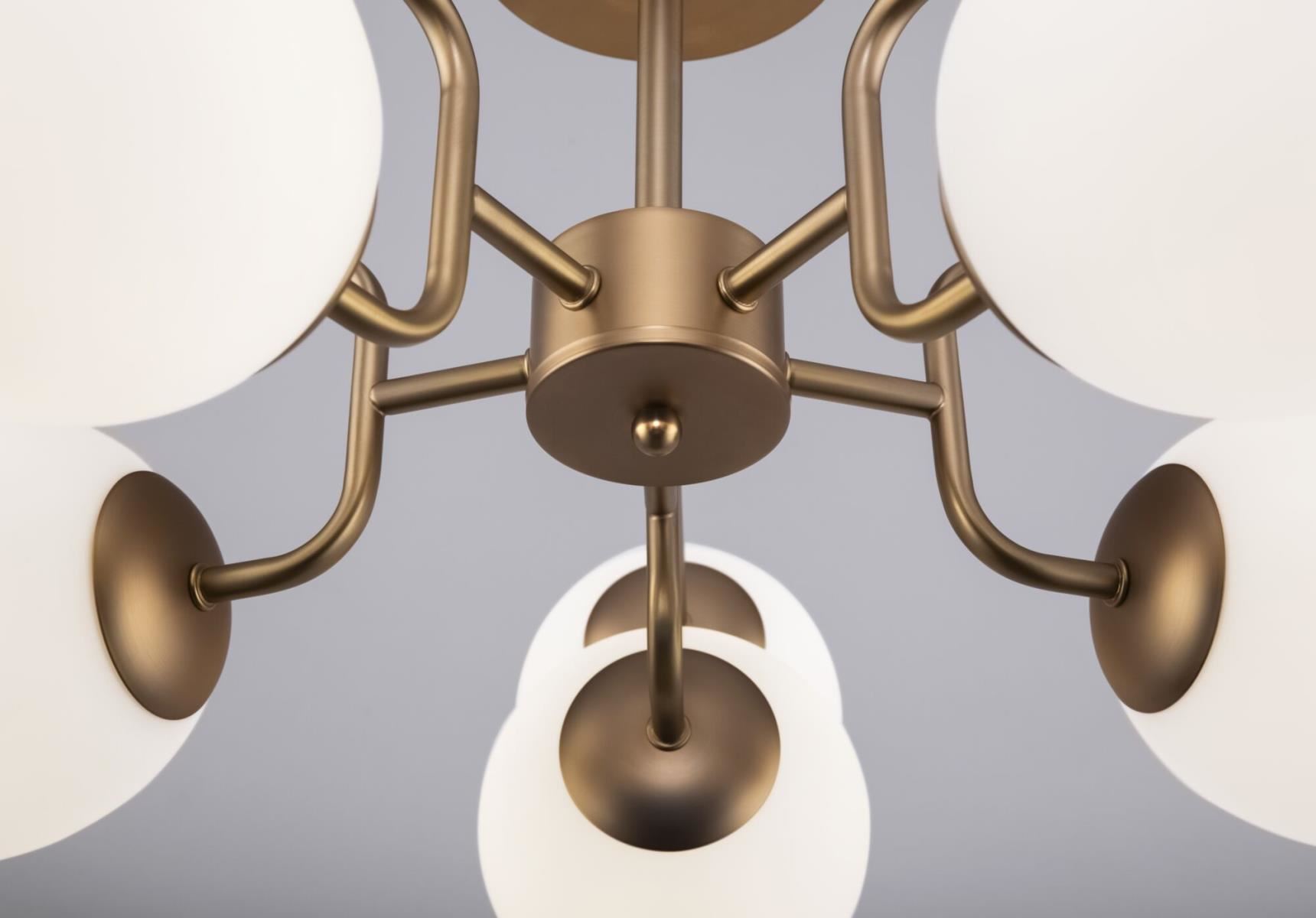 Белые плафоны из выдувного стекла похожи на жемчужины в обрамлении матового золотого или никелированного цвета металла. Серия представлена разными по размеру и применению моделями. Светильники можно использовать для общего и локального освещения, их конструкция максимально функциональна. У торшера и настольной лампы можно изменять положение плафона. Высота подвесных светильников регулируется длиной троса. У люстр центральная штанга состоит из трех частей, благодаря чему можно изменять высоту светильника. Дополнением коллекции являются потолочные светильники, которые максимально расширяют возможности использования свктильников серии в помещениях с различными переметрами.
