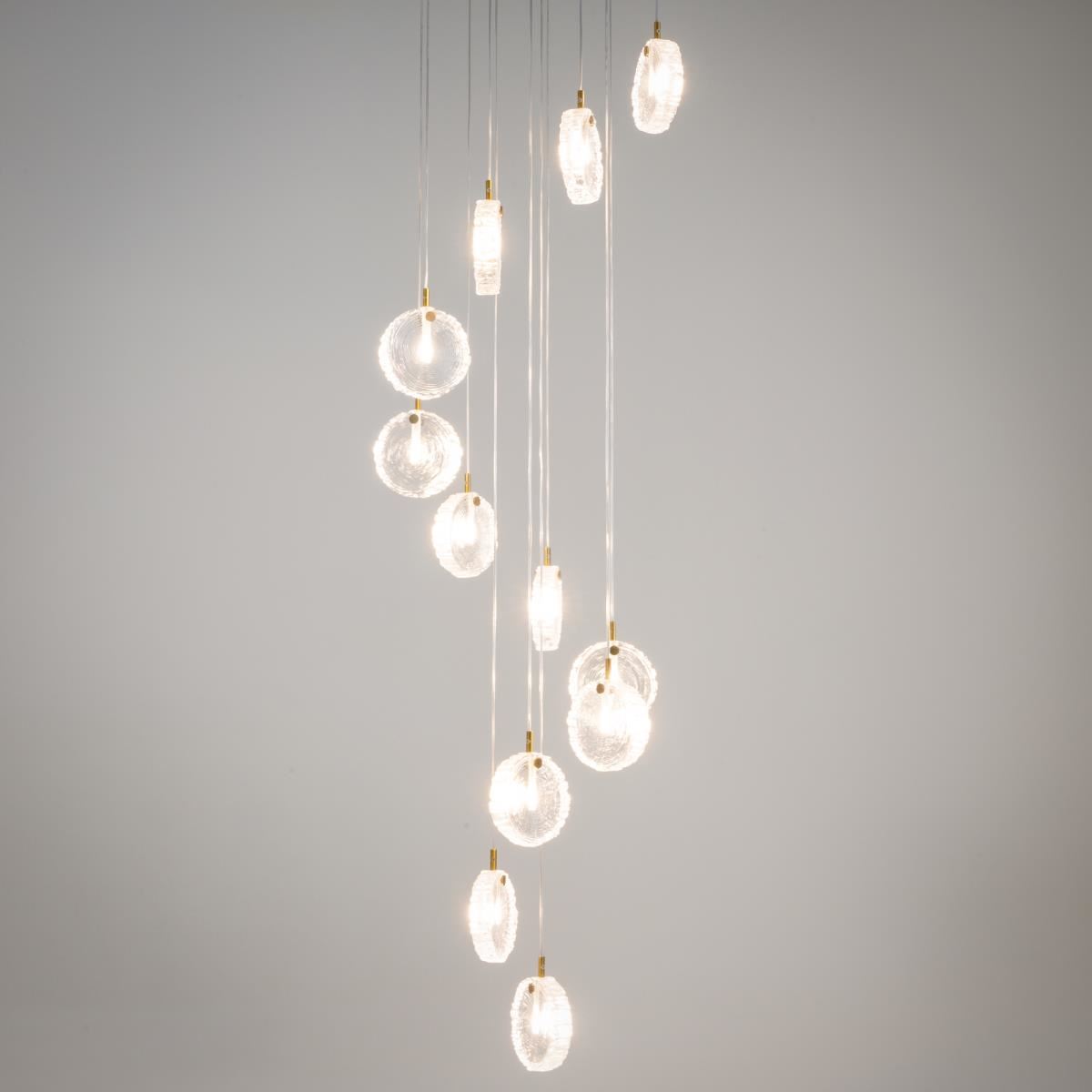 Материал арматуры - металл, цвет - латунь. Серия вдохновлена эстетикой северных лесов. Плафоны - литое цельное стекло в форме и фактуре среза дерева. Три варианта цвета плафонов: проздрачный; прозрачный + матовый; прозрачный + матовый + пастельно зеленый. Эстетичные крепления и магнитная потолочная чаша без видимых болтов. Готовые композиции из 1, 5, 7 и 12 плафонов. Источник света - лампа с цоколем G4.