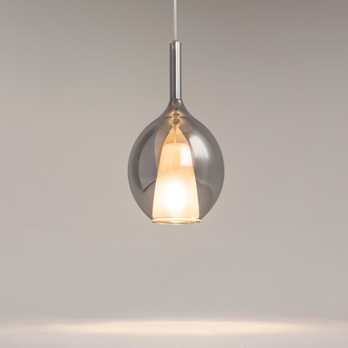 Металлическое основание, цвет - черный. Плафоны из двойного стекла. Внутренний прозрачный в форме конуса. Внешний плафон в трех геометрических формах, цвет стекла: зеркальные золотой, кофейный, дымчатый. Регулируемая длина провода - 3 метра. Источник света - лампа с цоколем Е27.