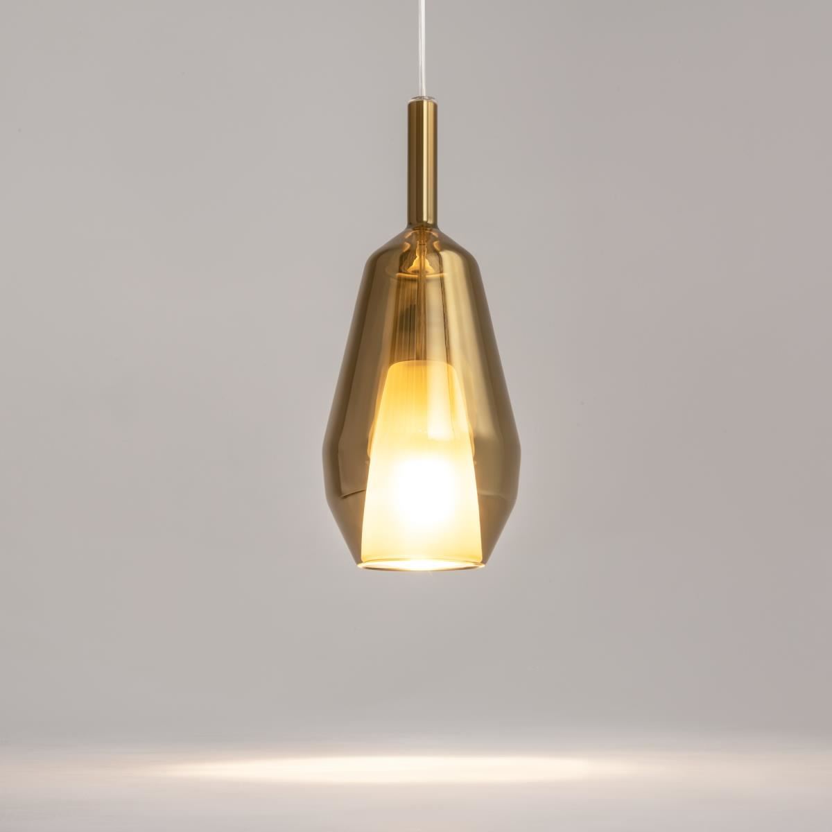 Металлическое основание, цвет - черный. Плафоны из двойного стекла. Внутренний прозрачный в форме конуса. Внешний плафон в трех геометрических формах, цвет стекла: зеркальные золотой, кофейный, дымчатый. Регулируемая длина провода - 3 метра. Источник света - лампа с цоколем Е27.