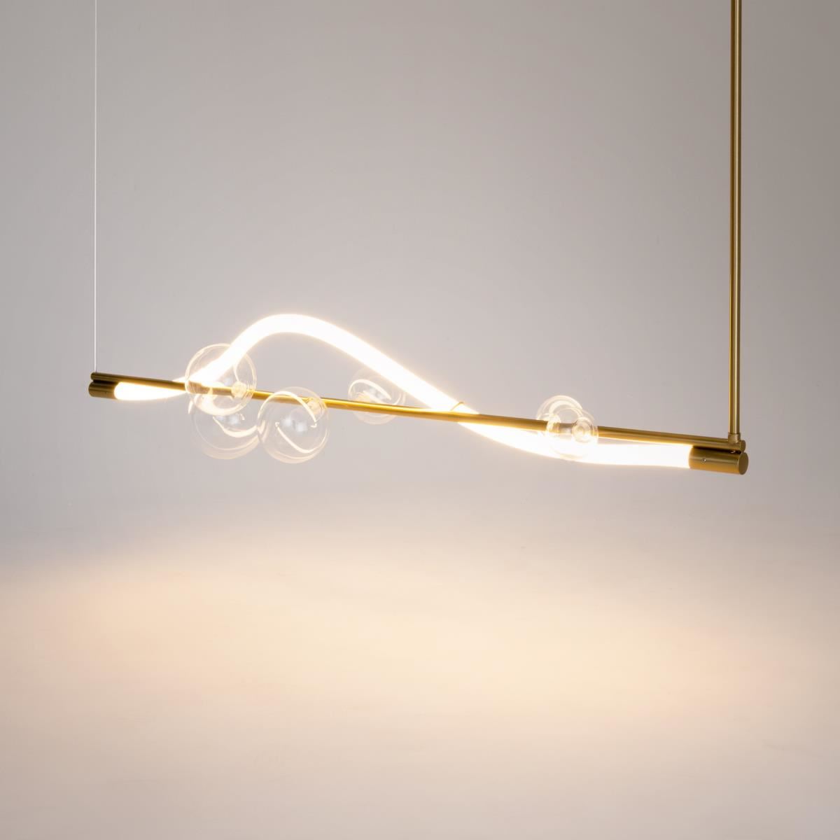 Арматура из металла цвета латуни, материал рассеивателя – текстильный жгут, декоративные элементы выполнены из прозрачного выдувного стекла. LED-источник света. Цветовая температура 3000К, угол рассеивания света 360°. Вертикальное настенное бра включается touch-сенсором. Тканевый шнур. Высота подвесных светильников регулируется.