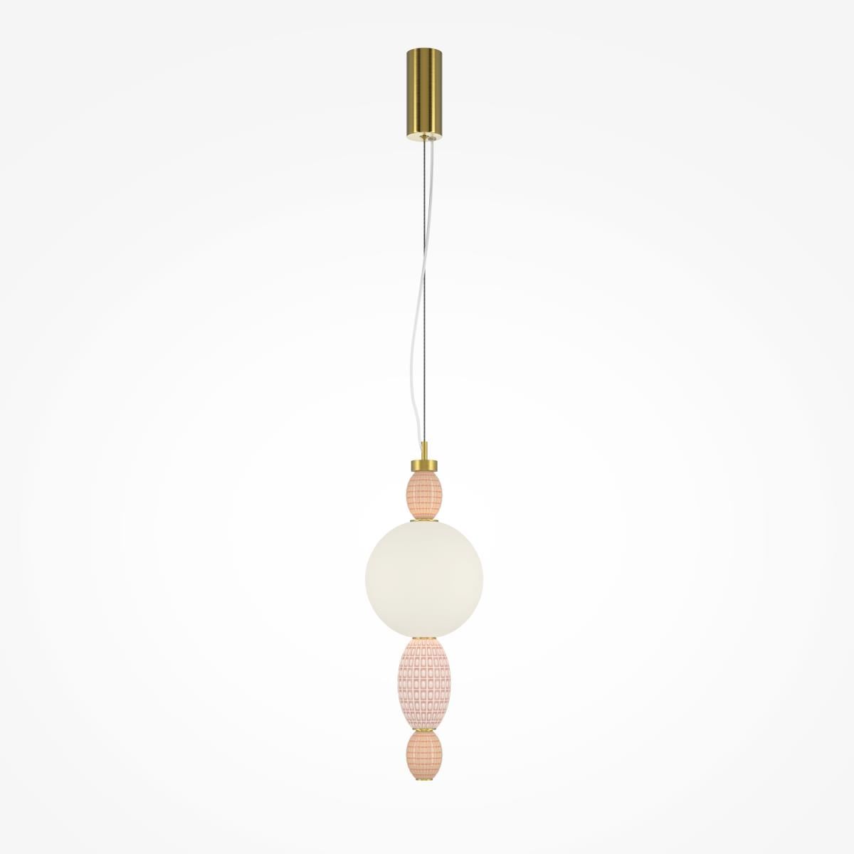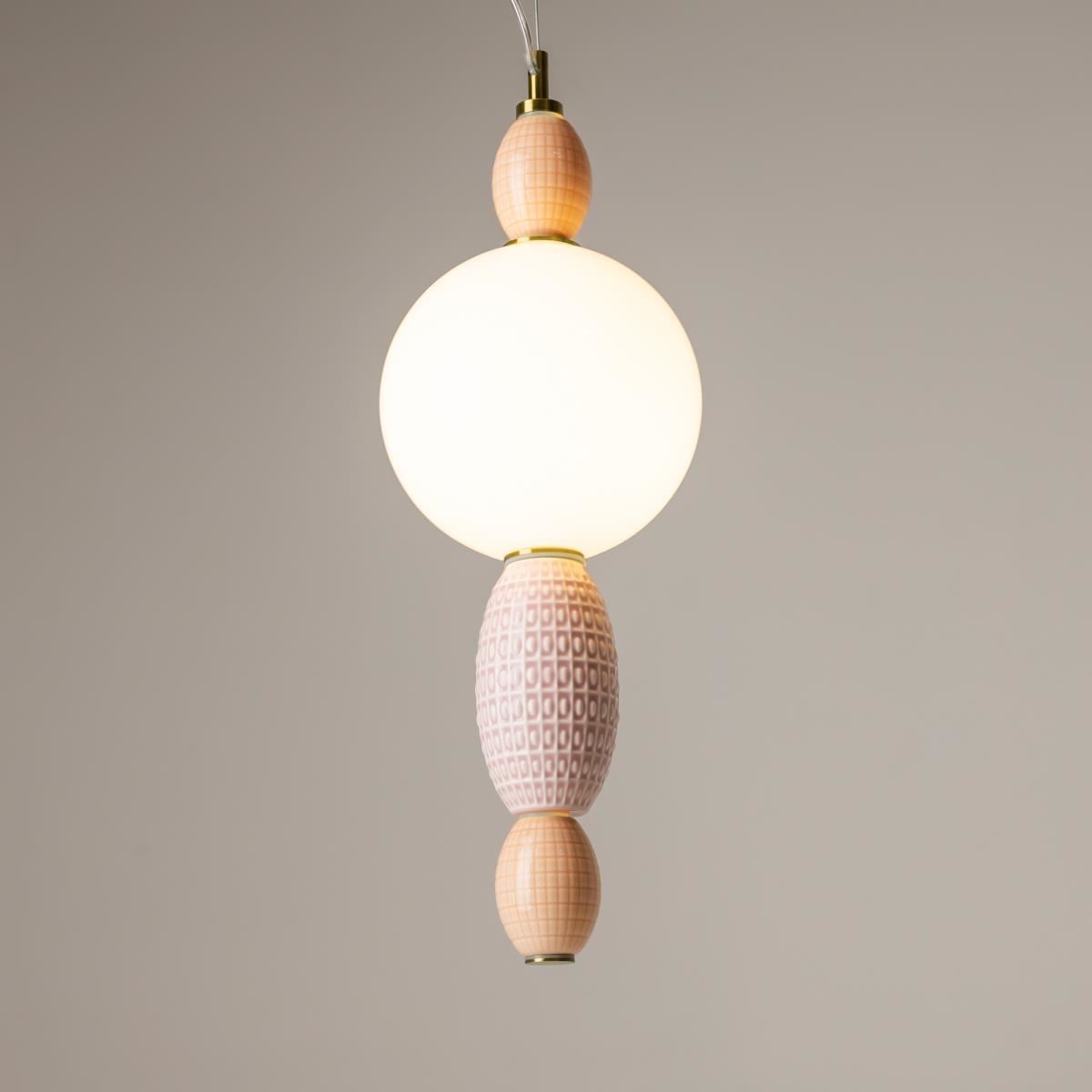 Металлическая арматура цвета латуни. Плафоны из белого стекла для мягкого, равномерного освещения, декоративные элементы из цветной керамики. Угол рассеивания 120°. Цветовая температура – 3000 К. Регулируемый провод длиной 3 м.
