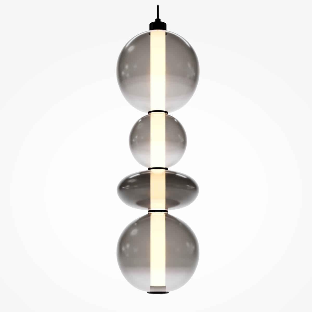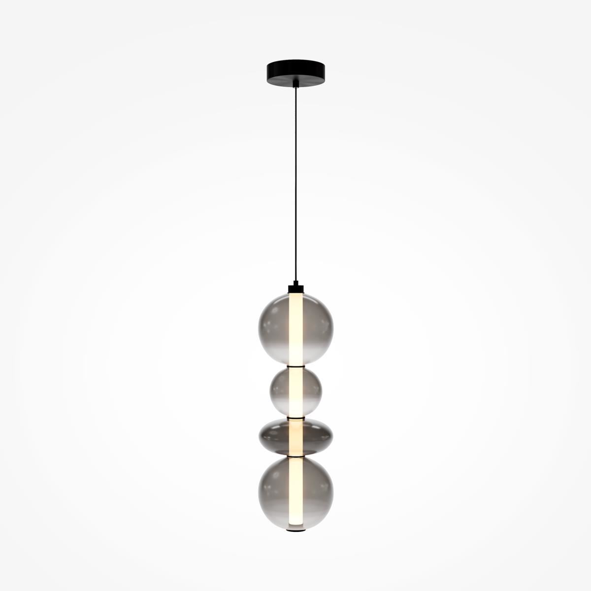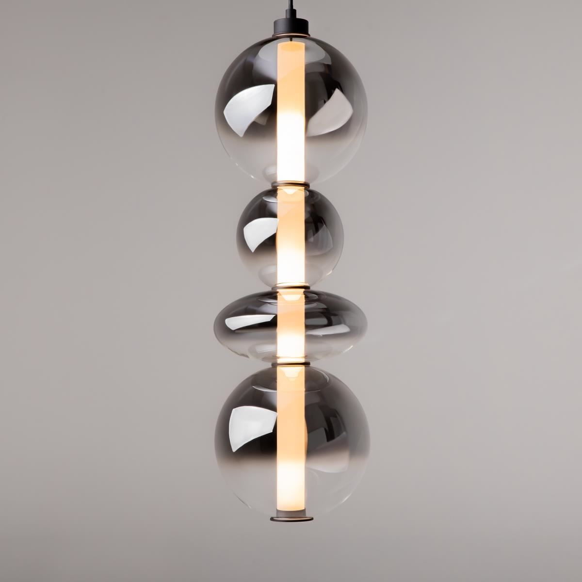 Светильники с тонированными выдувными стеклянными плафонами (дымчатыми или янтарными) и металлической арматурой (черной или цвета латуни). Окрашивание плафонов градиентное. Источник света: LED. Световой элемент установлен внутри акрилового рассеивателя. Цветовая температура источника света – 3000К, угол рассеивания — 120°. Торшеры снабжены Push-кнопкой на проводе.