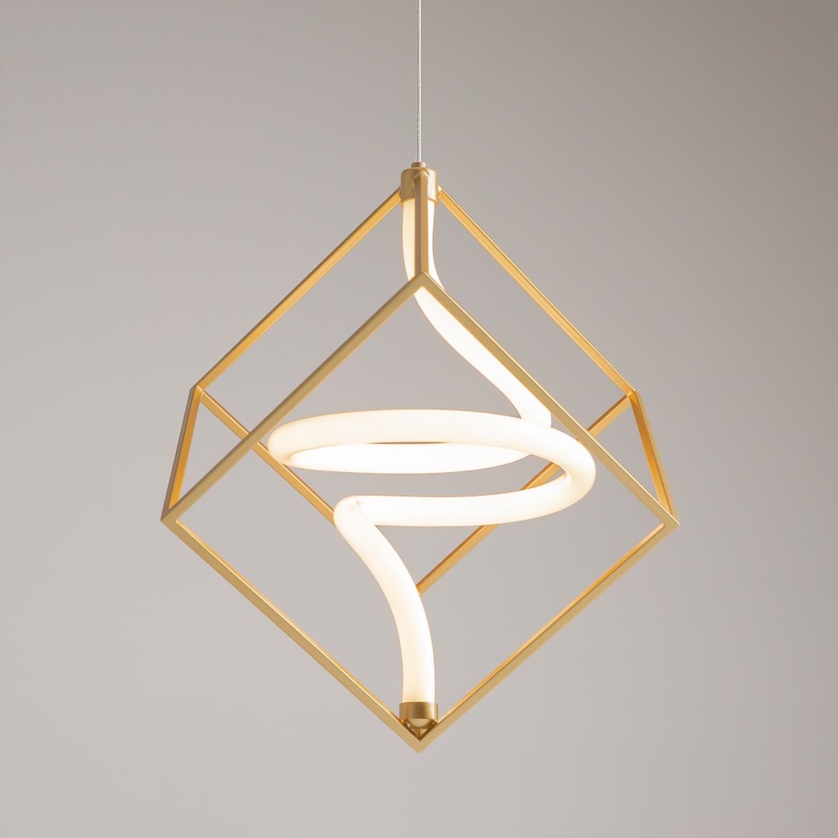 Металлическая арматура, цвет - латунь. Графичный силуэт. Источник света - гибкая неоновая трубка, расположенная внутри арматуры. Угол рассеивания — 120 градусов. Дизайн светильников подходит для интерьера в стиле лофт, а также индустриального стиля. Регулируемый провод подвесного светильника — 3 м.