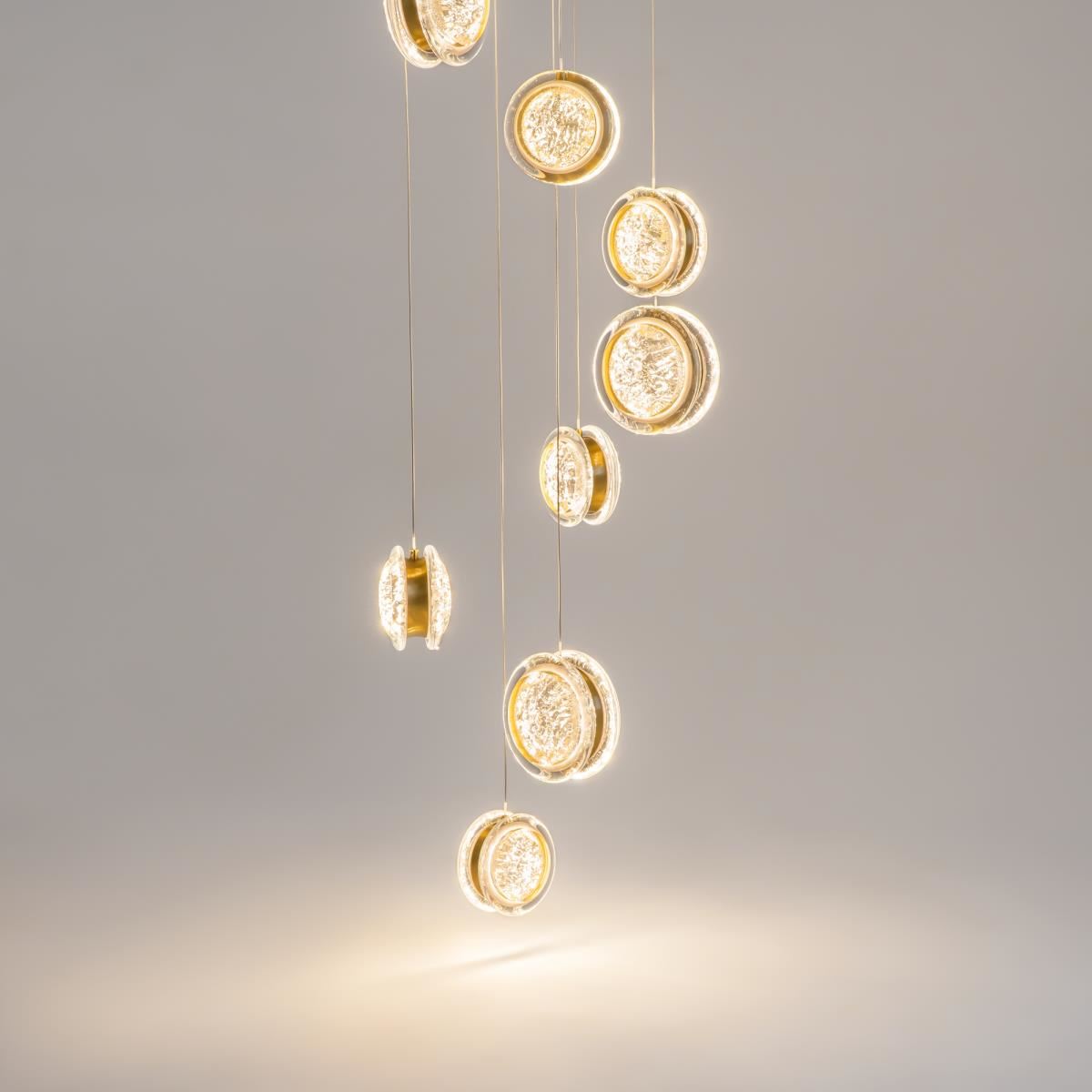 Арматура из металла цвета латунь с сатинированным финишным покрытием сочетается с прозрачными плафонами. Подвесные одинарные, горизонтальный и каскадные светильники оснащаются LED-модулем с двумя плоскими плафонами из акрила со сложным, актуальным паттерном на поверхности. Цветовая температура — 3000К, угол рассеивания — 125 градусов.