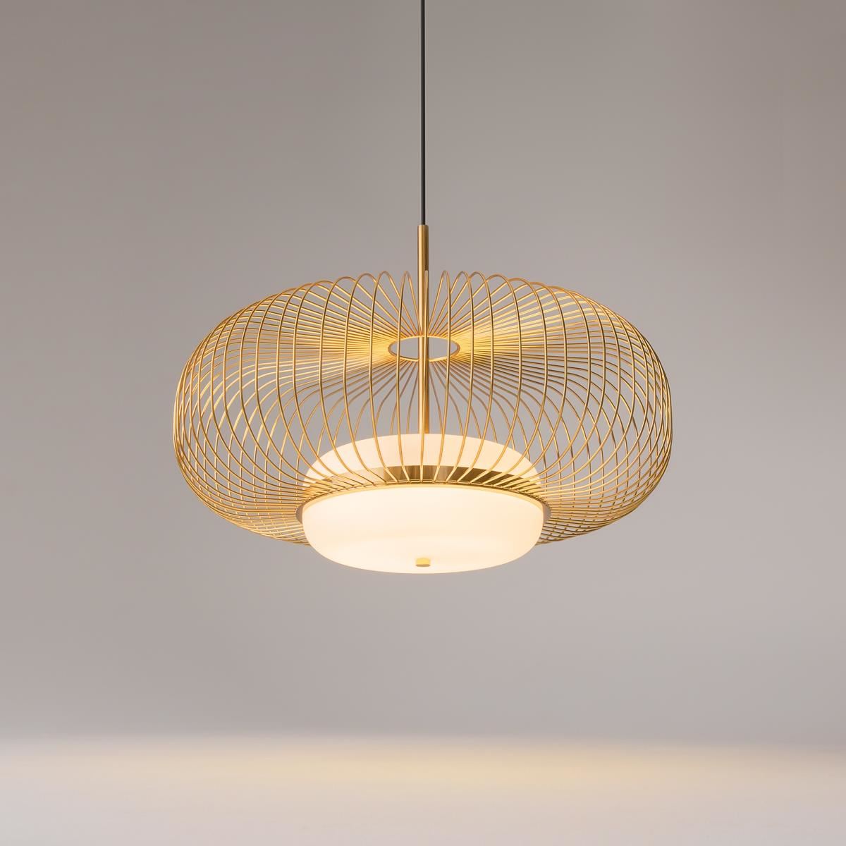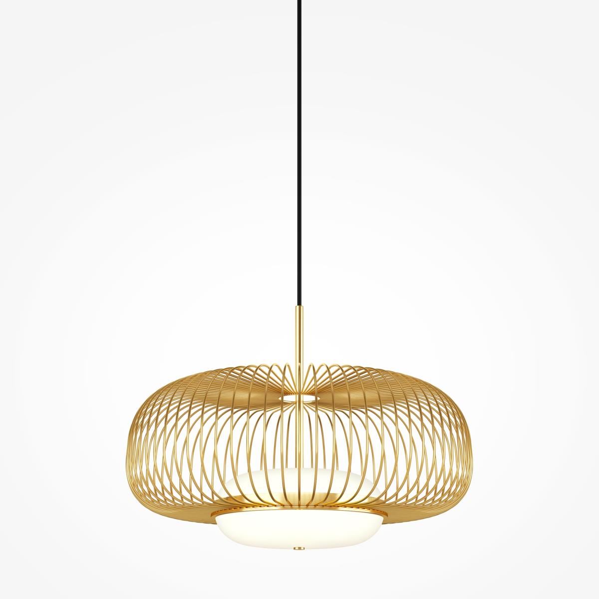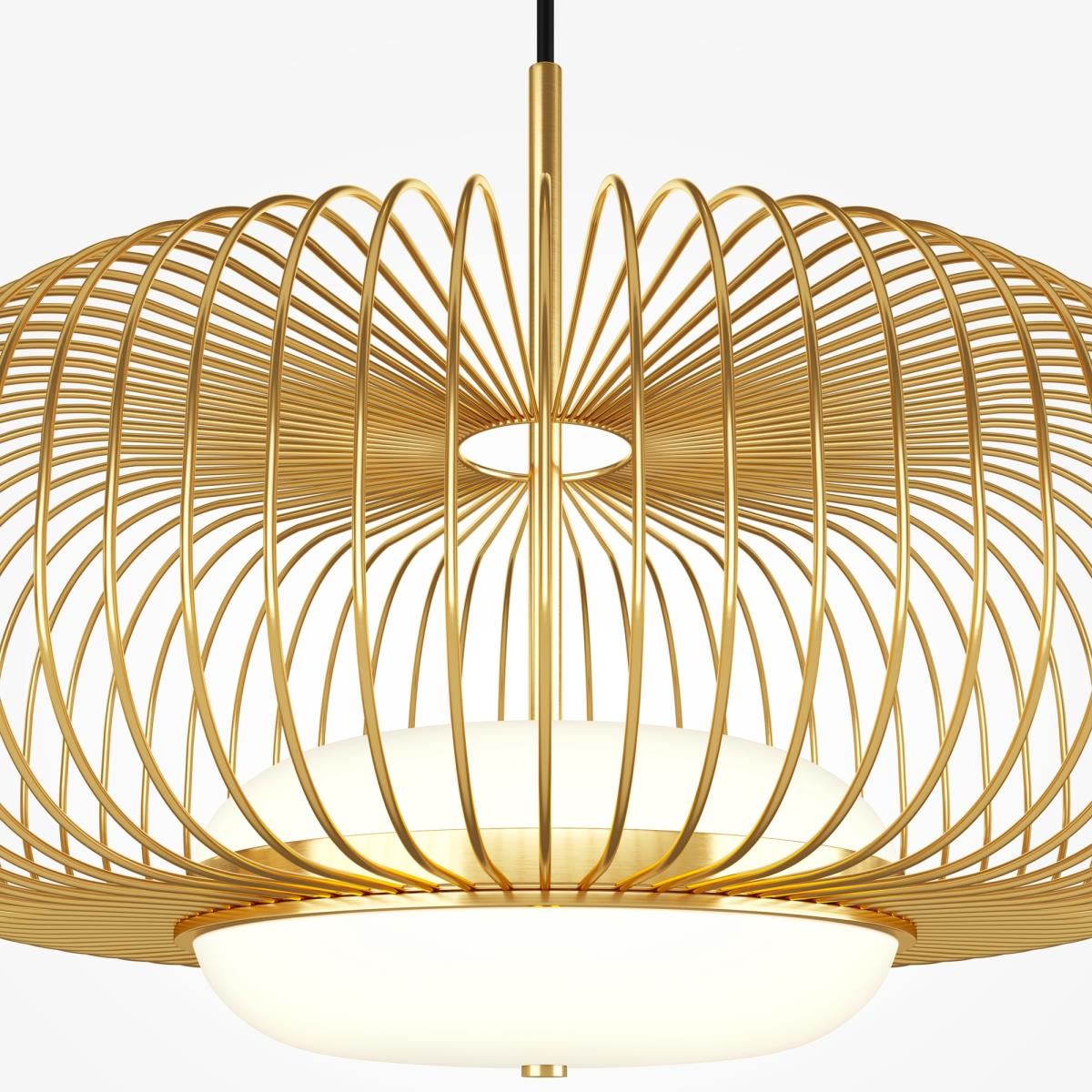 Цвет арматуры — латунь. Материал арматуры — металл. Абажур — каркас из проволоки, стекло. Оригинальный дизайн с эффектом левитации. Стеклянный рассеиватель со специальным выступом для крепления проволочного плафона. Два типа подвесных светильников: компактные со сменными лампами и крупный с LED-модулем для двунаправленного освещения. Провод длиной 3 метра для высоких потолков. Регулируемая высота подвеса. Универсальный дизайн для неоклассики, эклектики и фьюжн.