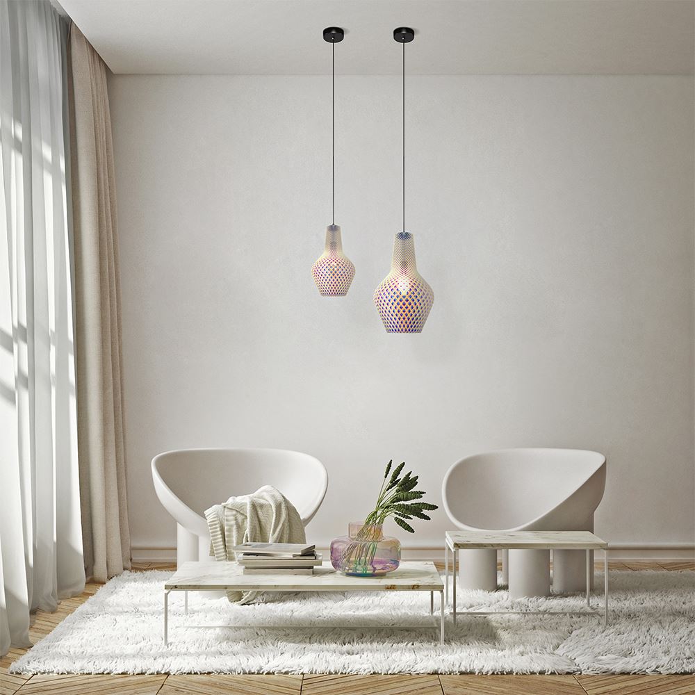 Элегантный силуэт светильников серии безупречно впишется в пространство современного интерьера. Преодолевая рифленую поверхность плафонов из выдувного стекла, свет ложится узором на поверхности предметов. Арматура изготовлена из металла. Высоту светильников можно изменять, регулируя длину шнура.