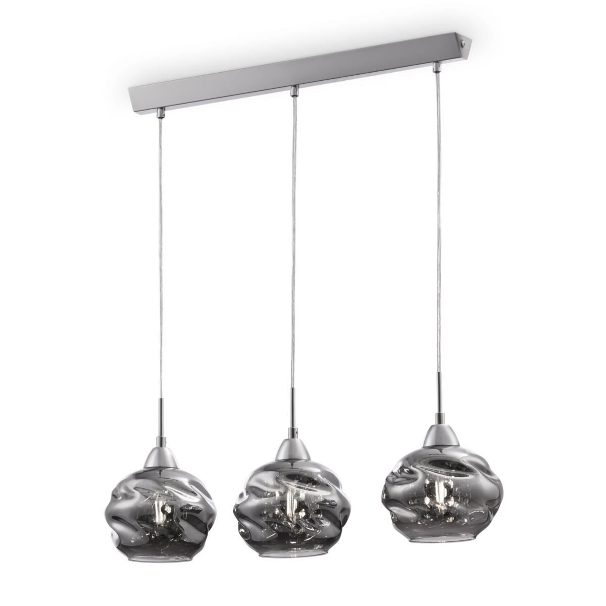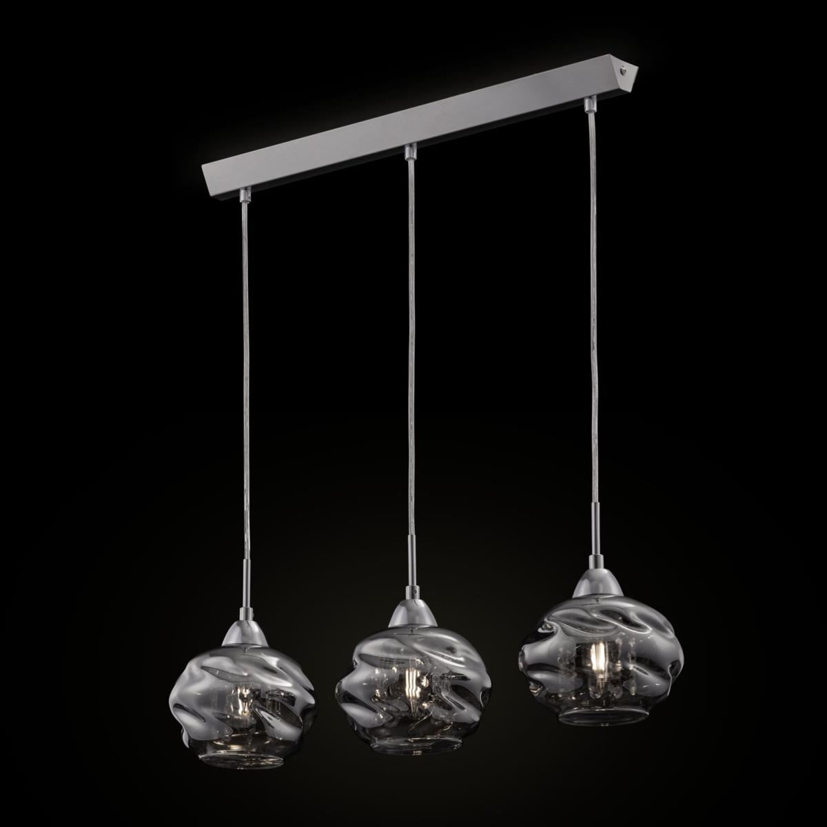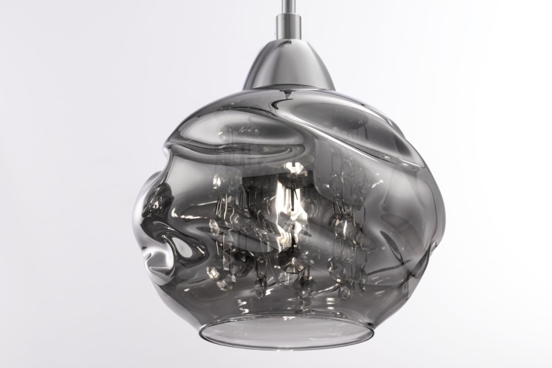 Космическая форма стеклянных плафонов формирует необычный облик светильников серии Haze. Дымчатые плафоны надежно скрывают от глаз наблюдателя лампу и подвески из кристаллов, которые при включенном свете создают неповторимые иллюзорные образы. Арматура изготовлена из хромированного металла. Модели серии представлены одиночным светильником и линейной композицией из трех светильников.
