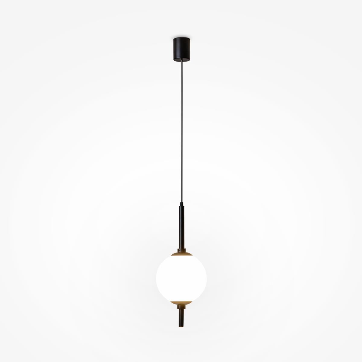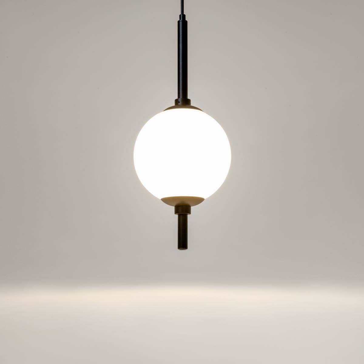 Металлическая арматура в черном цвете. Плафоны-сферы из белого стекла.