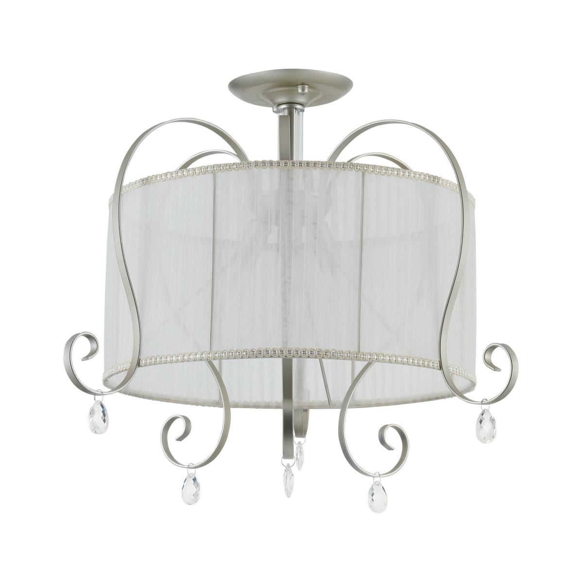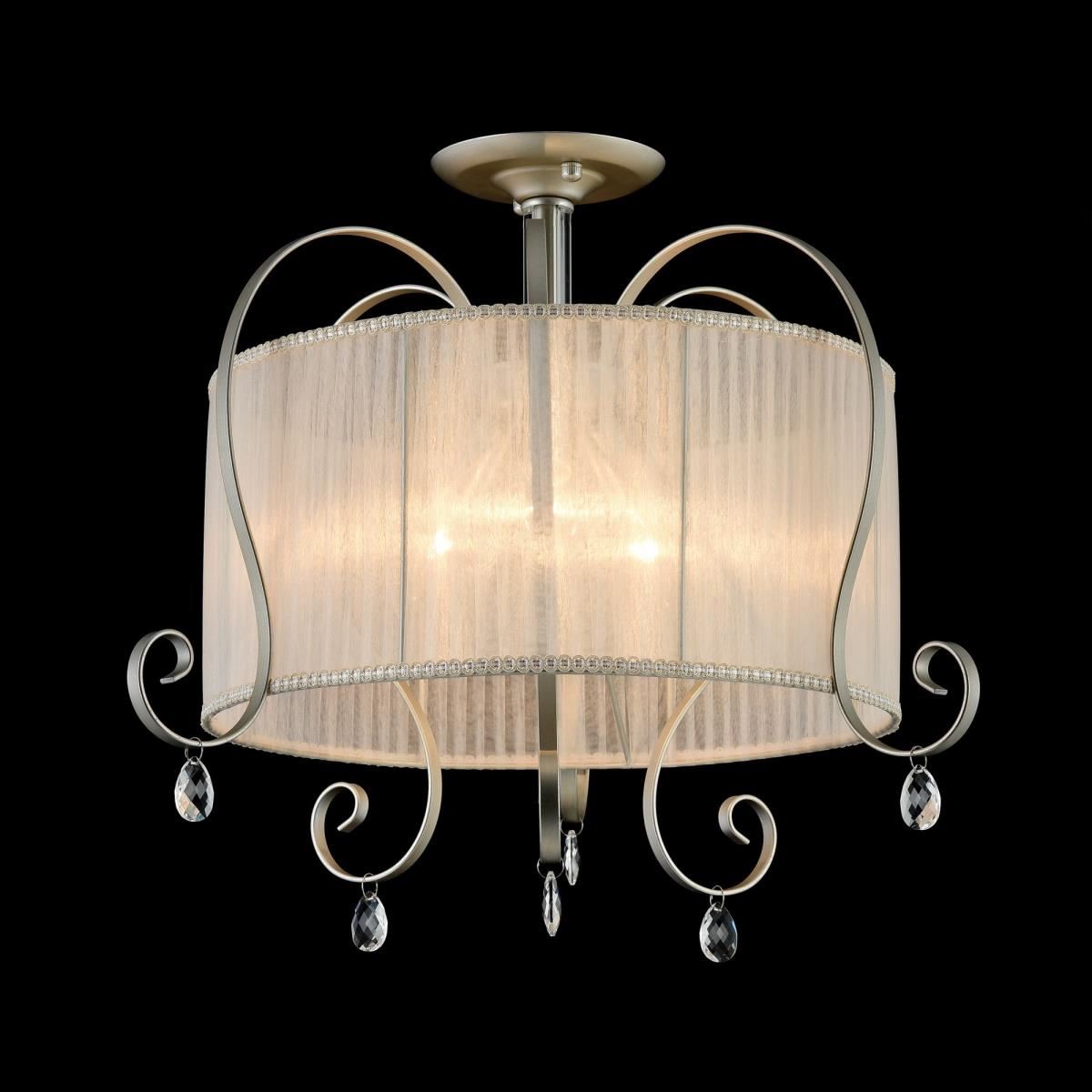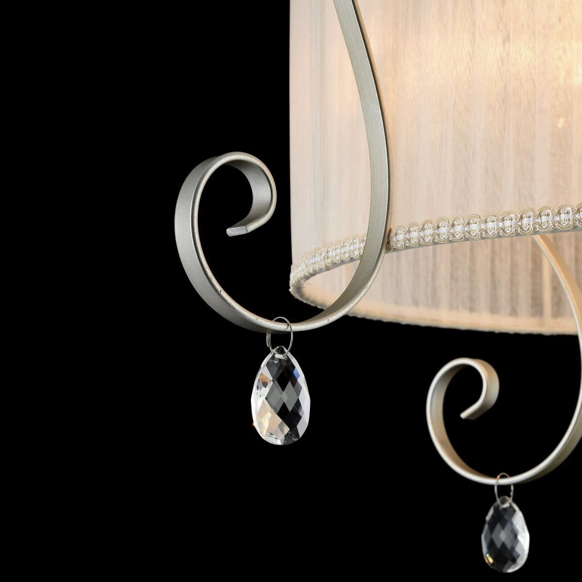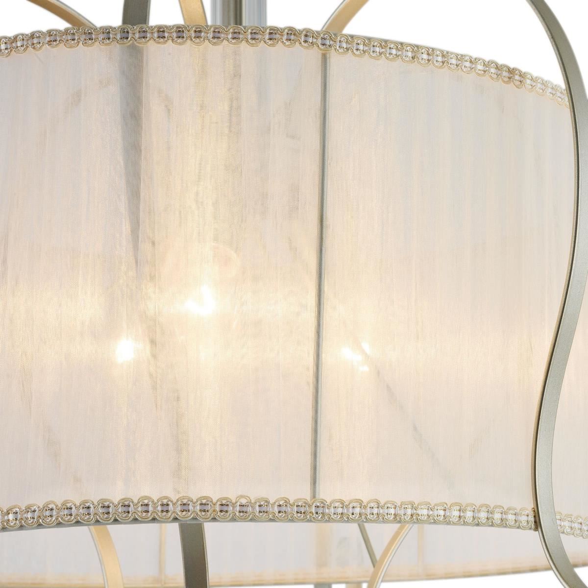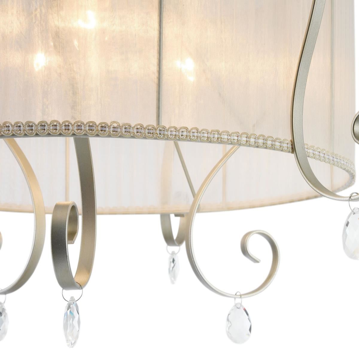 Абажуры и арматура светильников выполнены в разных цветах, с несколькими видами арматуры. Основание люстры украшено стеклянным декоративным элементом, а завитки рожков украшают подвески.