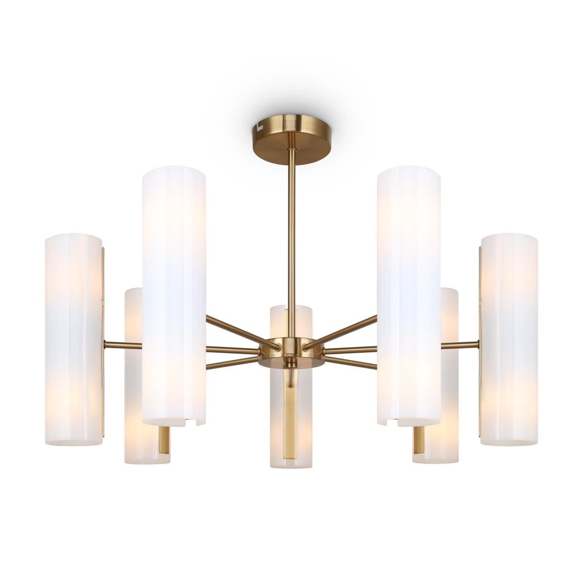 Арматура — металлическая, цвет — латунь. Стеклянные белые плафоны-цилиндры мягко рассеивают свет в стороны. Открытые края плафонов и глянцевая поверхность дают дополнительный свет в вверх и вниз для максимальной освещенности. Источник света — лампа с цоколем Е14.