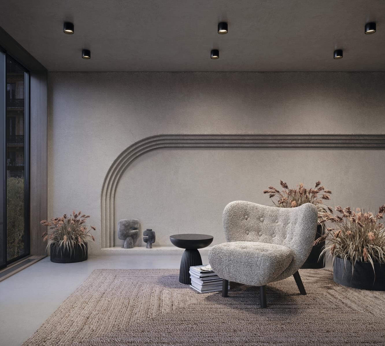 Серия полочных светильников из металла, окрашенных в черный и белый цвета. В конструкции предусмотрено 2 светодиодных источника света. Один выполняет роль основного освещения, другой предназначен для декоративной подсветки. Короткими, последовательными выключениями можно выбрать один из трех режимов работы.