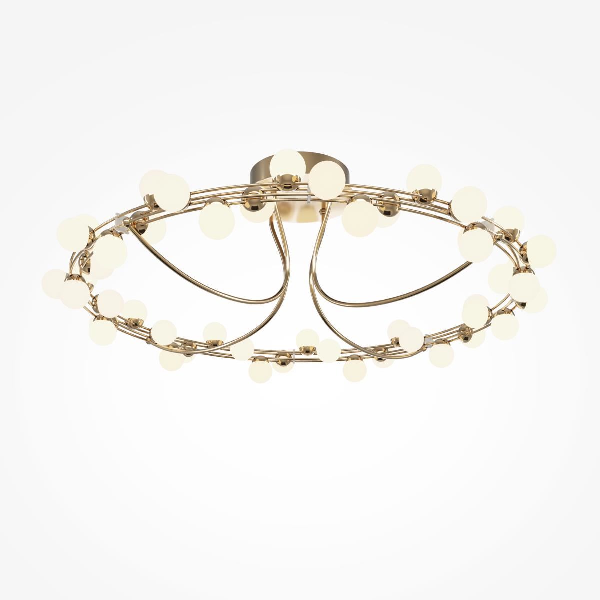 Арматура из металла в золотом цвете. Плафоны-сферы — белый пластик. Дизайн с имитацией молекулярной структуры. LED-источники света.