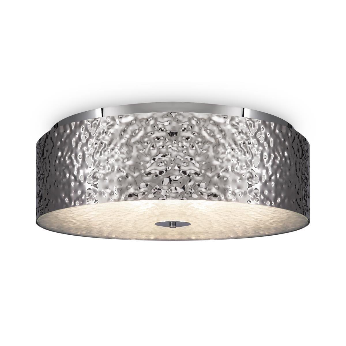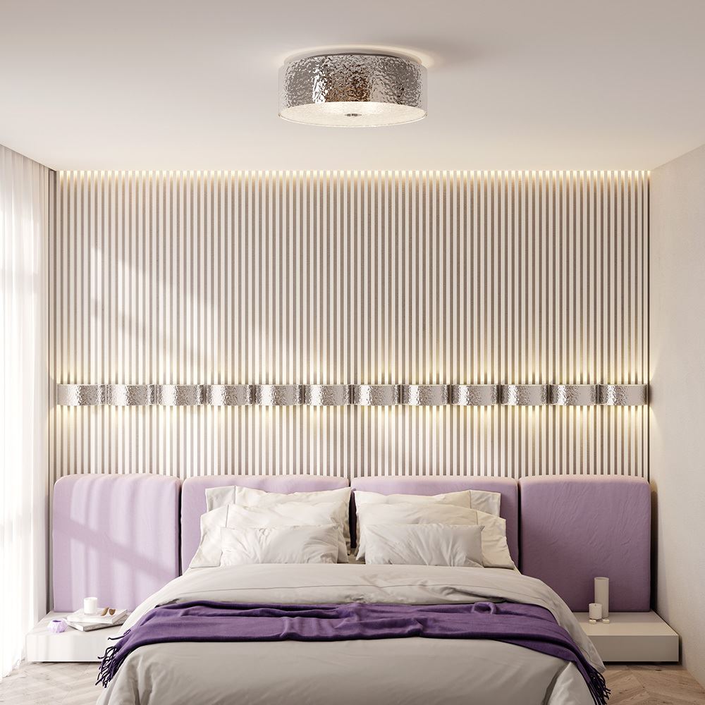 Главная характерная черта светильника Ripple — это металл, который с помощью чеканки приобрел особую фактуру. Его рифленая металлизированная поверхность создает эффект «рябь на воде», превращая модель в самостоятельный арт-объект, придавая динамичность интерьеру, буквально оживляя его. Дополнительного внимания требует стекло, которое обладает схожей текстурой. Его рифленая поверхность делает световой поток мягким и рассеянным. Серия Ripple включает потолочные светильники, подходящие для помещений с невысокими потолками.