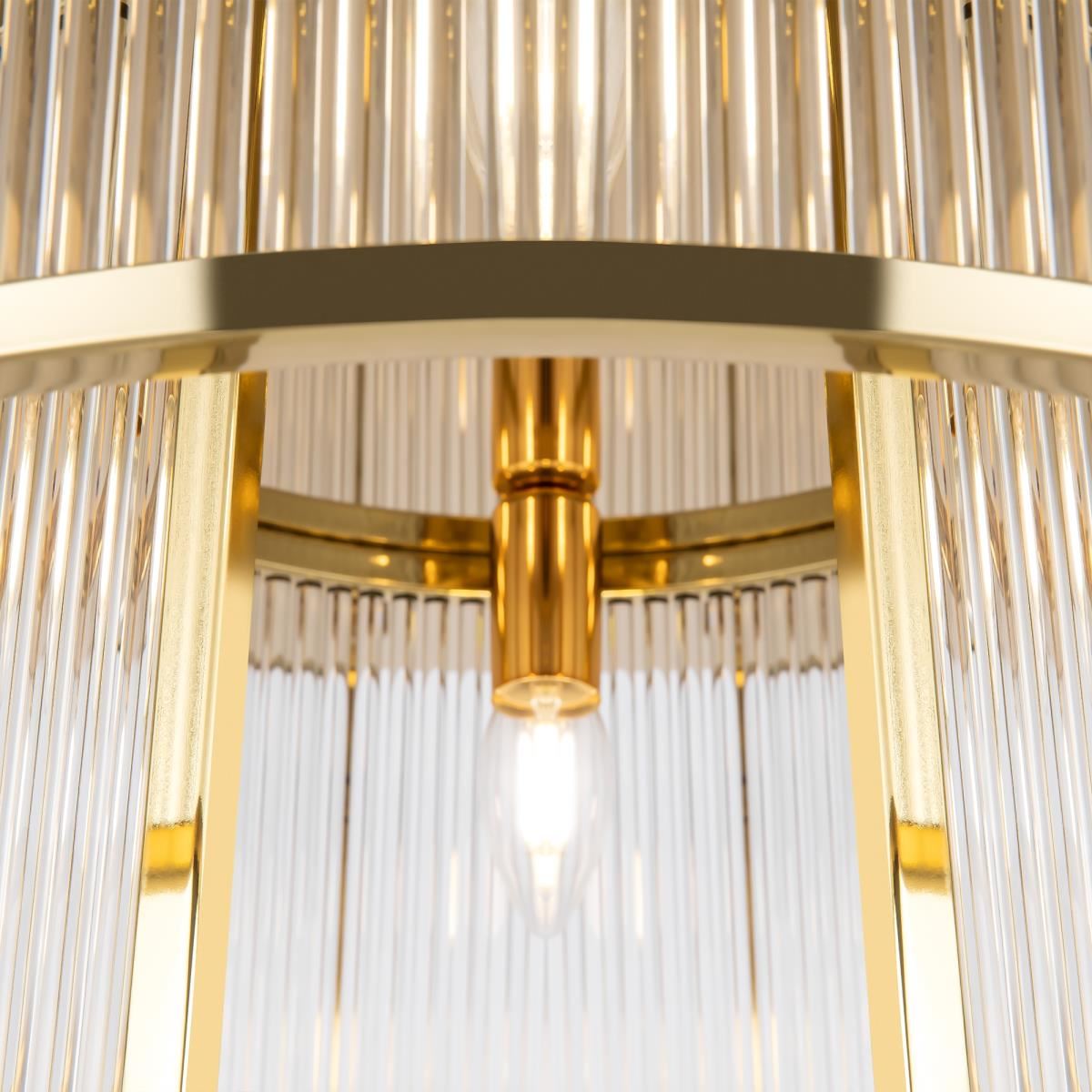 Материал арматуры - металл, цвет - золото. Декоративный элемент из прозрачного стекла в форме рельефных трубок. Цоколь Е14. Лампы в комплект не входят.