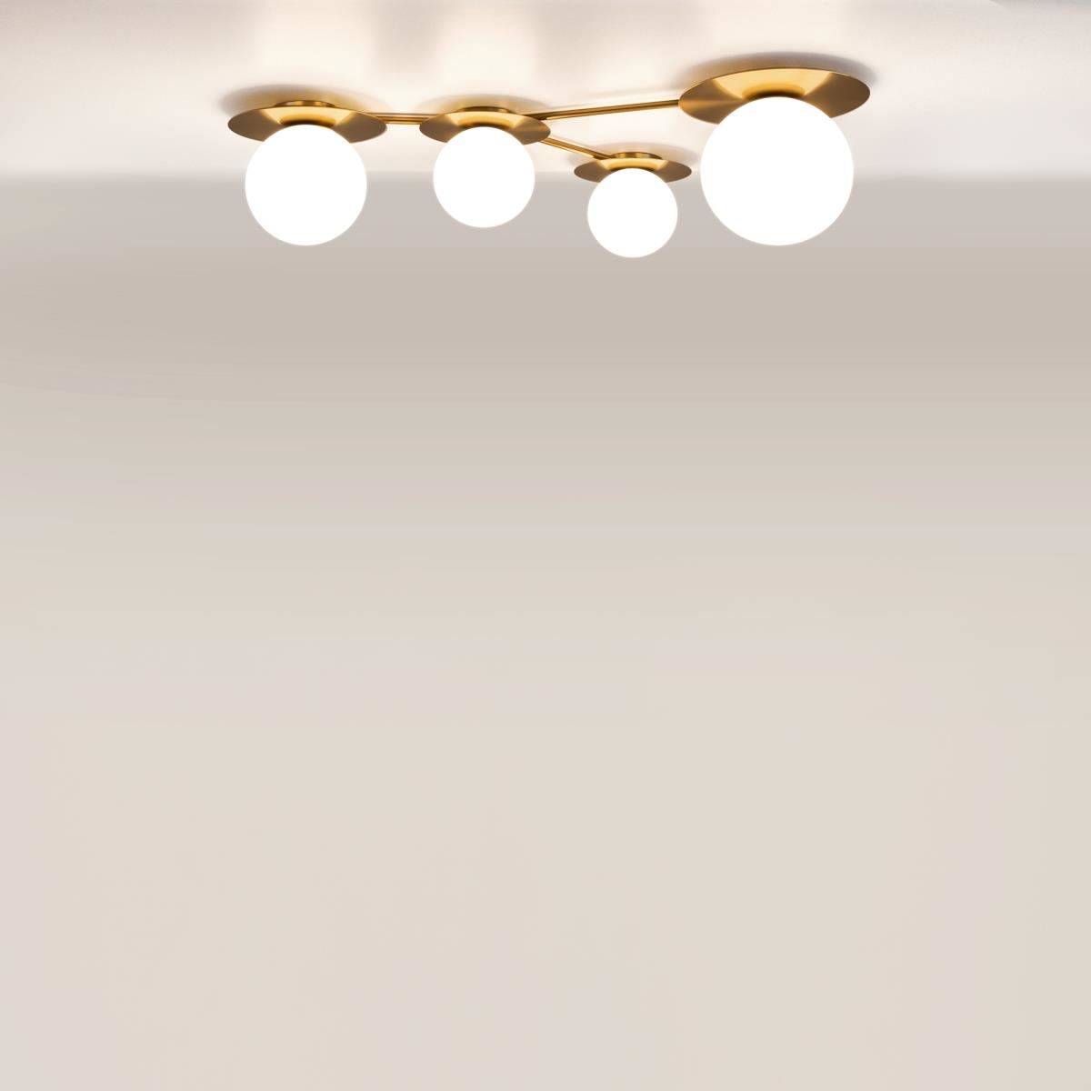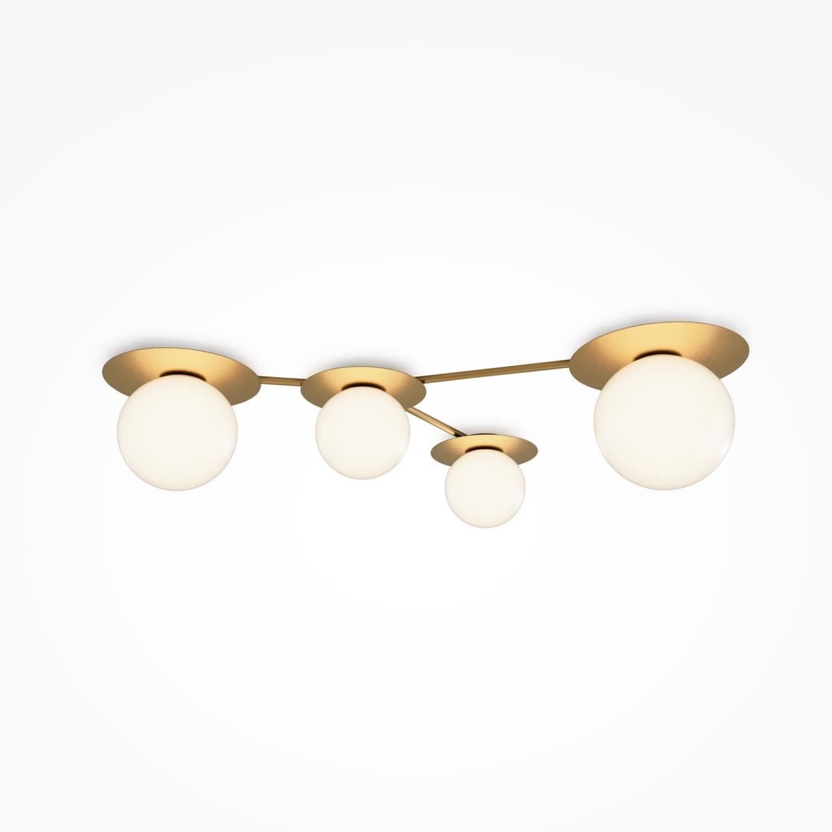 Компактное металлическое основание и арматура цвета латуни. Две модели с плафонами белого цвета и две с разноцветными плафонами: серый, прозрачный, дымчатый и оттенка коньяка. Источник света: цоколь Е14. Компактное основание светильника прилегает к потолку. Функциональное основное освещение. Местоположение разноцветных плафонов можно менять, создавая композиции по своему вкусу. Поверхность плафонов имеет орнамент, при включении светильника на потолке создаются узоры.