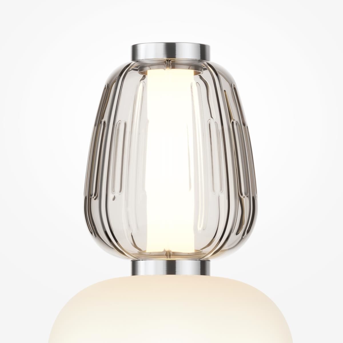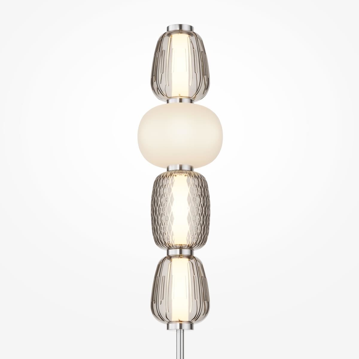 Металлическая арматура, цвет - золото, хром. Микс плафонов округлых и вытянутых форм из белого матового и прозрачного стекла с сетчатым и с линейным повторяющимся рельефным рисунком. Регулируемая высота подвесных моделей, провод - 3 метра. LED-источник света, цветовая температура 3000К.